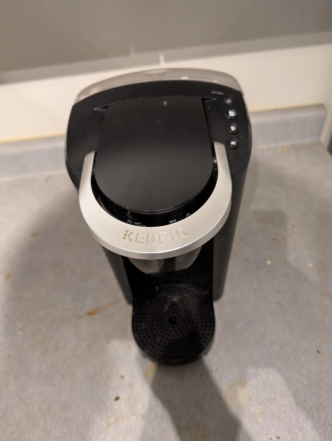 Selling a Keurig coffee maker! It's in good working condition and ready to brew your favourite coffee. It's black and perfect for any kitchen countertop. Small crack on filling unit.