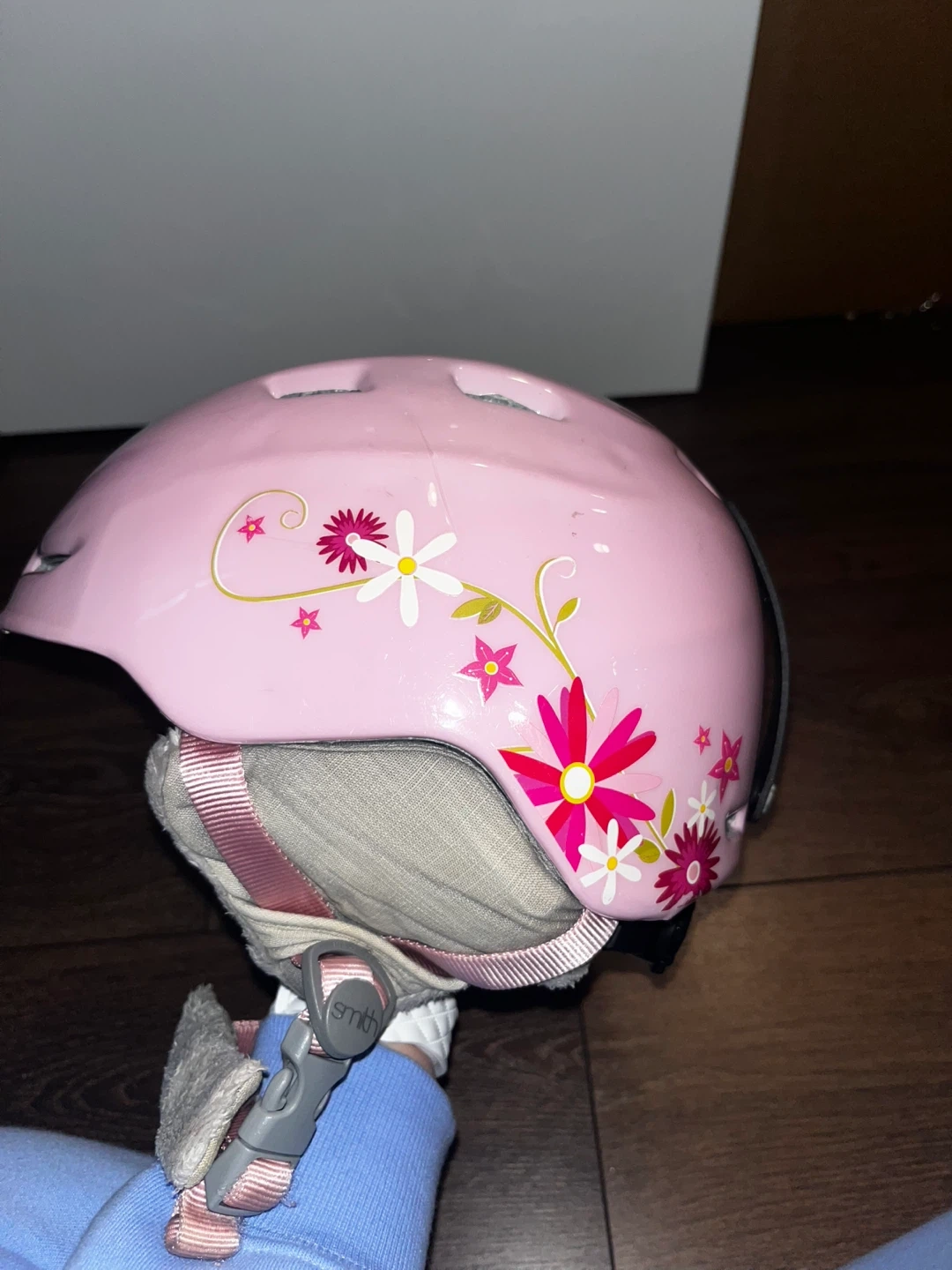 Selling a Smith Zoom Jr. ski helmet in pink with a cute floral stickers. It's a youth size Y/S, fitting head circumferences of 48-53cm. Great for keeping your little one safe and stylish on the slopes!