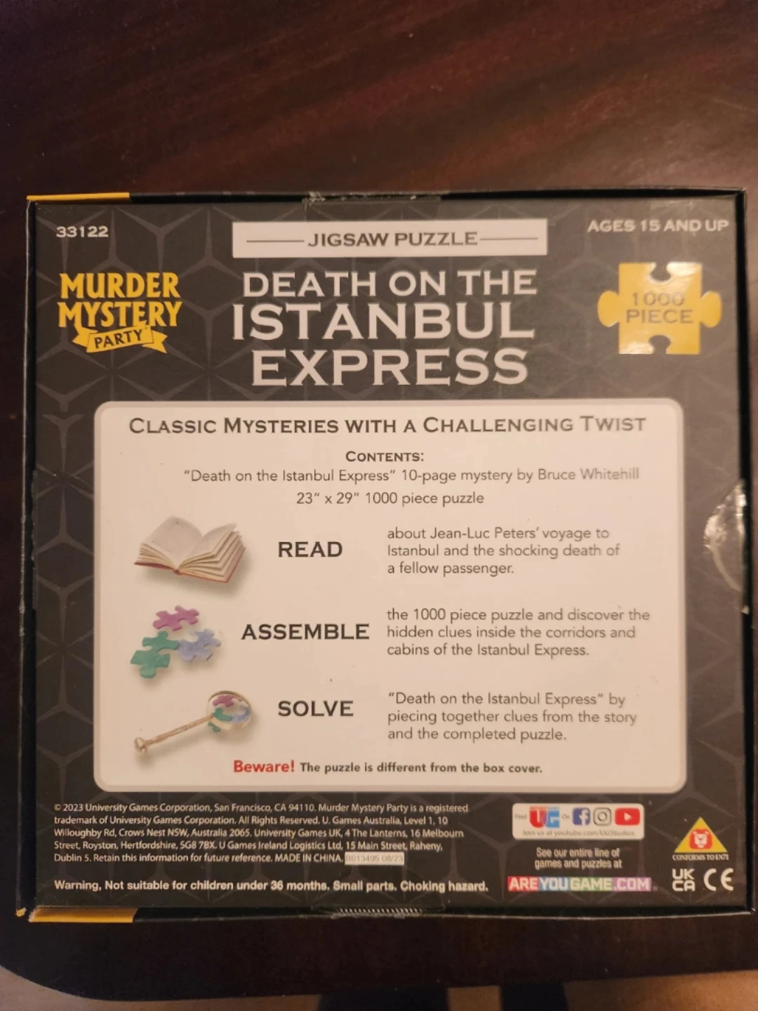 Get ready to solve a mystery with this 1000-piece jigsaw puzzle! It's the 'Death on the Istanbul Express' from the Murder Mystery Party series. The box includes a 10-page mystery by Bruce Whitehill, so you can piece together clues from the story as you assemble the puzzle. The finished puzzle is 23" x 29".