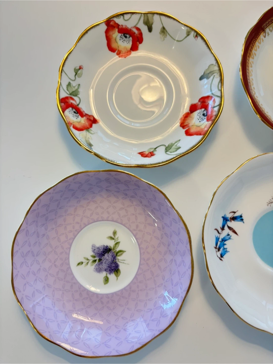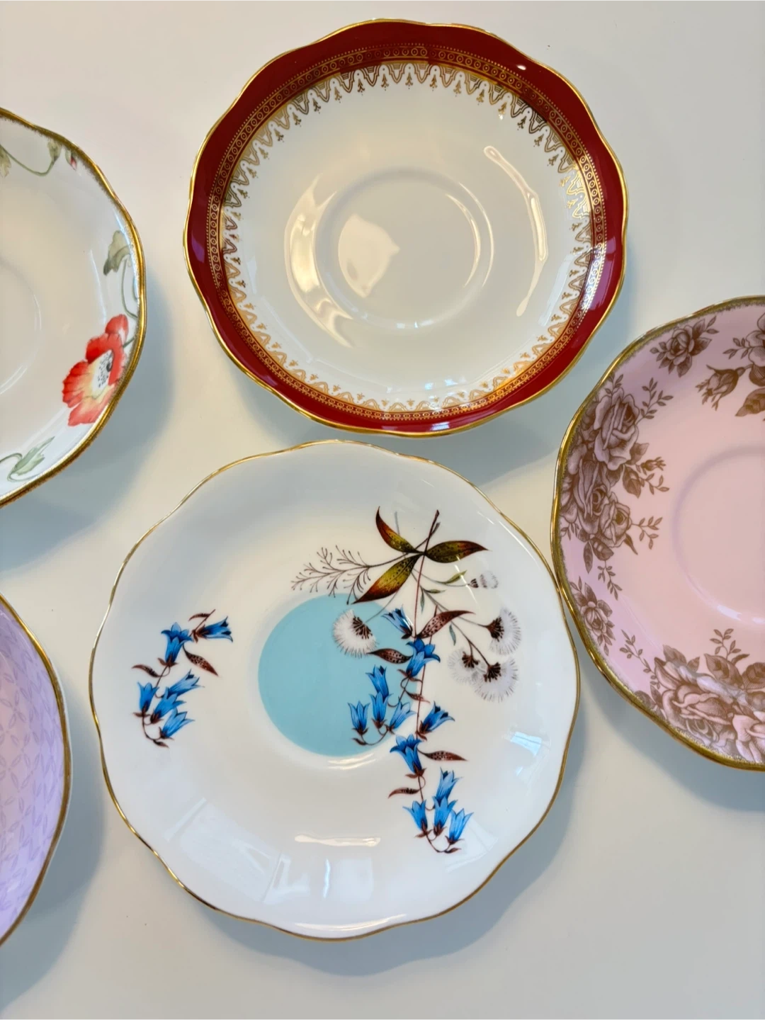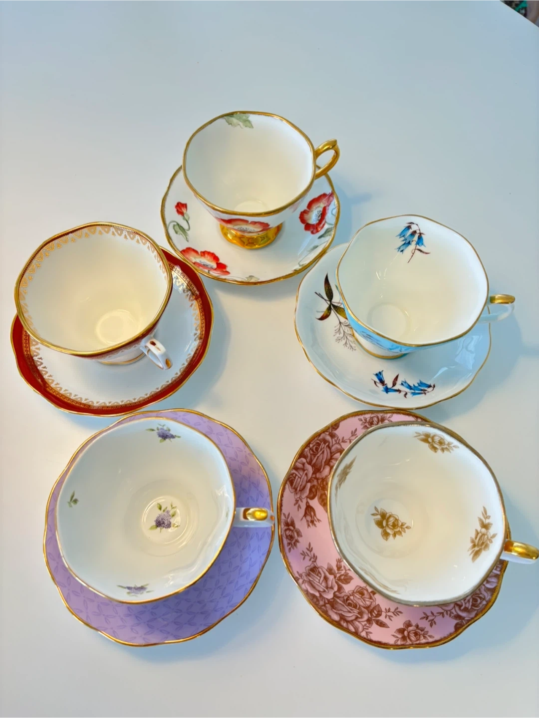 Beautiful "100 Years of Royal Albert" tea cup and saucer collection. This set features five iconic designs representing different decades. All pieces are in excellent condition with no chips, cracks, or crazing. The gold rims are well-preserved.