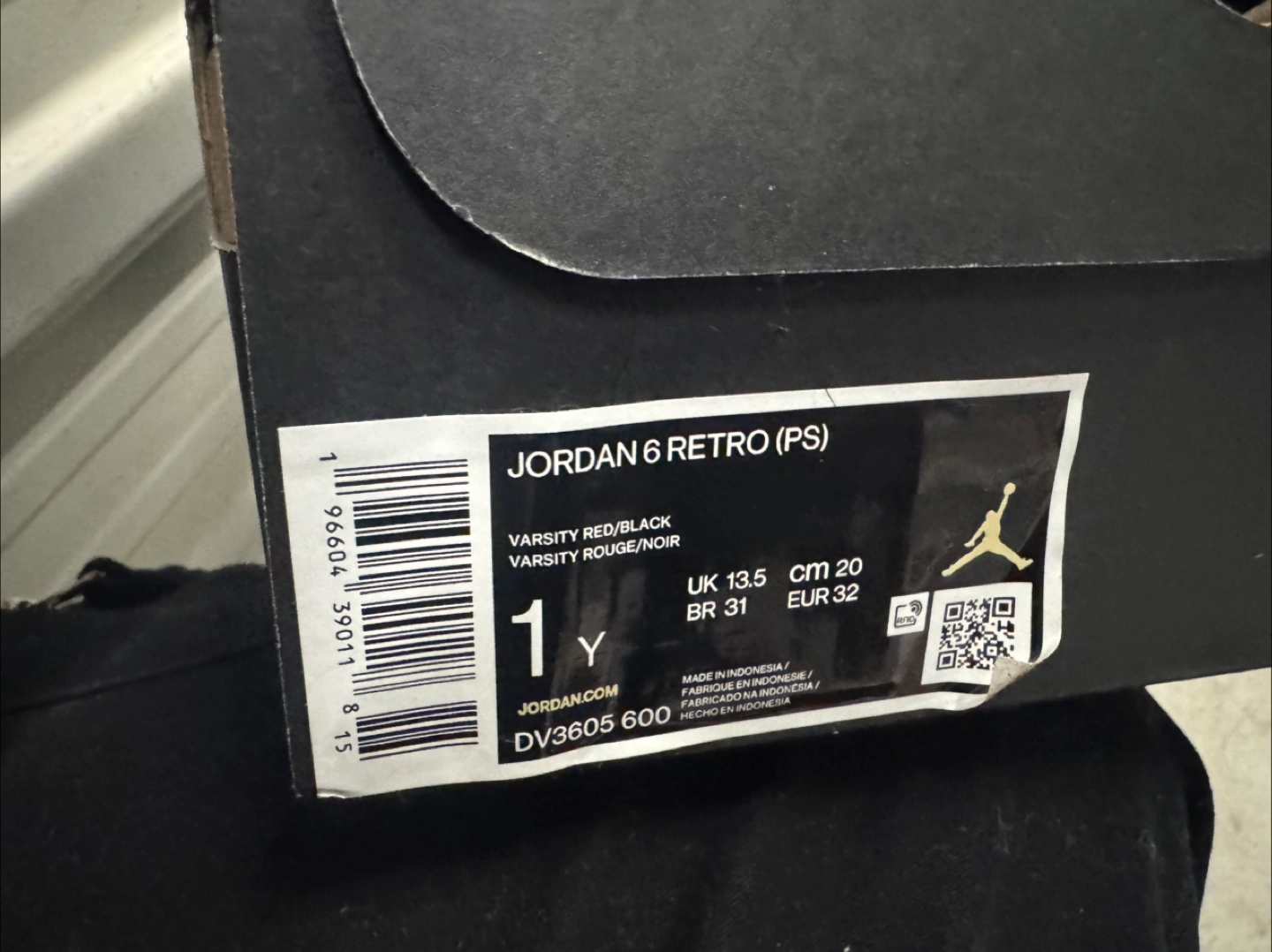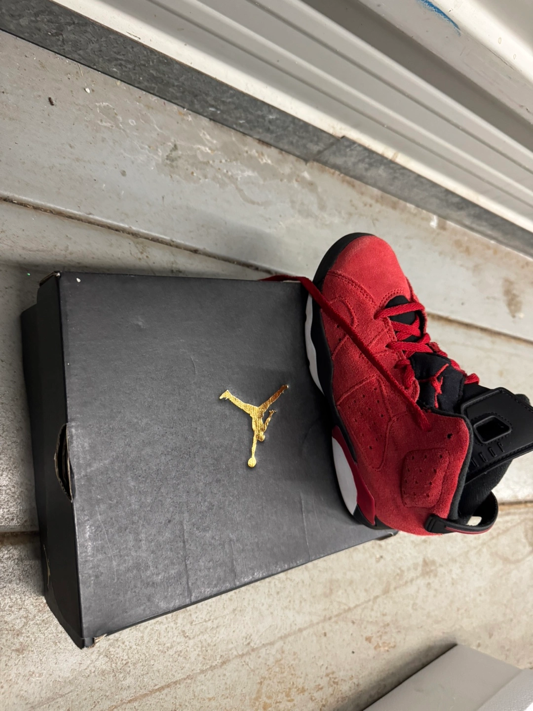 Selling a pair of Jordan 6 Retro (PS) in Varsity Red/Black! These are a size 1Y and come with the original box