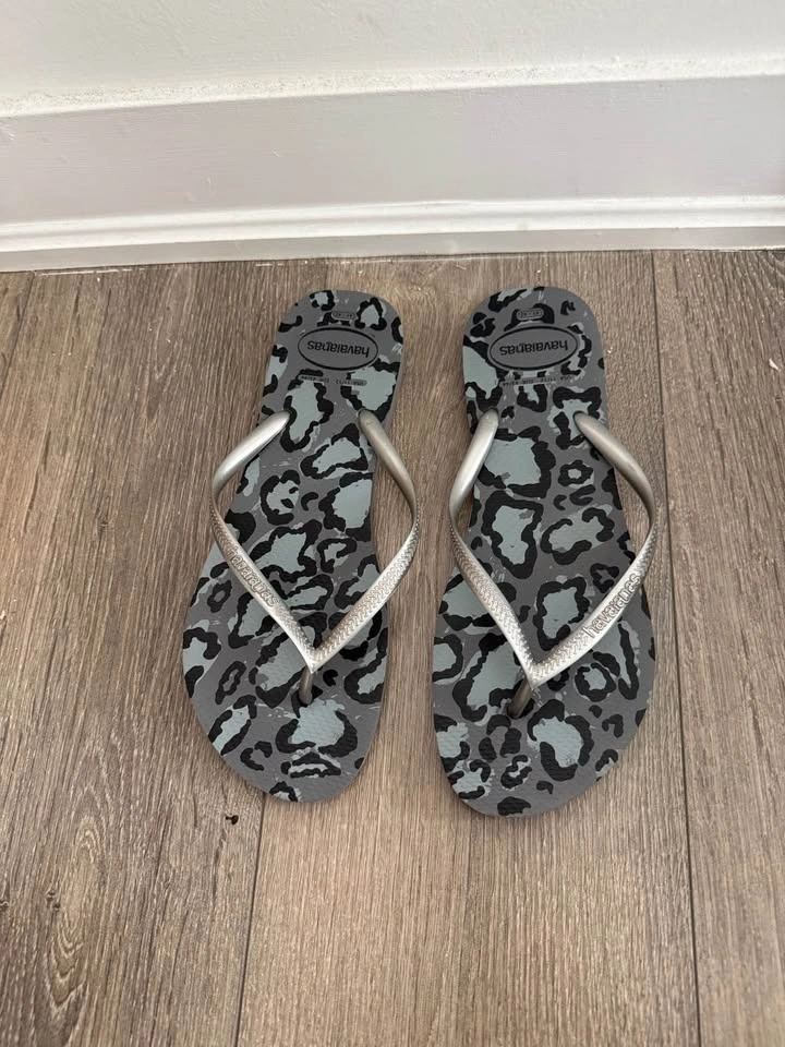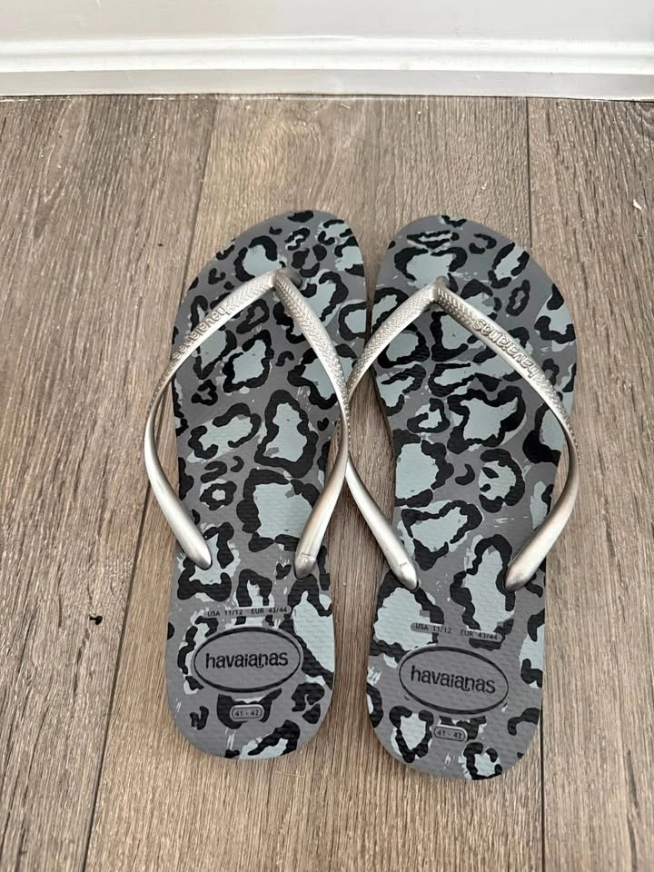 Havaianas leopard print flip flops with metallic silver straps — women’s size 11/12 (EUR 43/44). Only worn twice, excellent condition. Originally ~$30 CAD, priced low for a quick sale.
