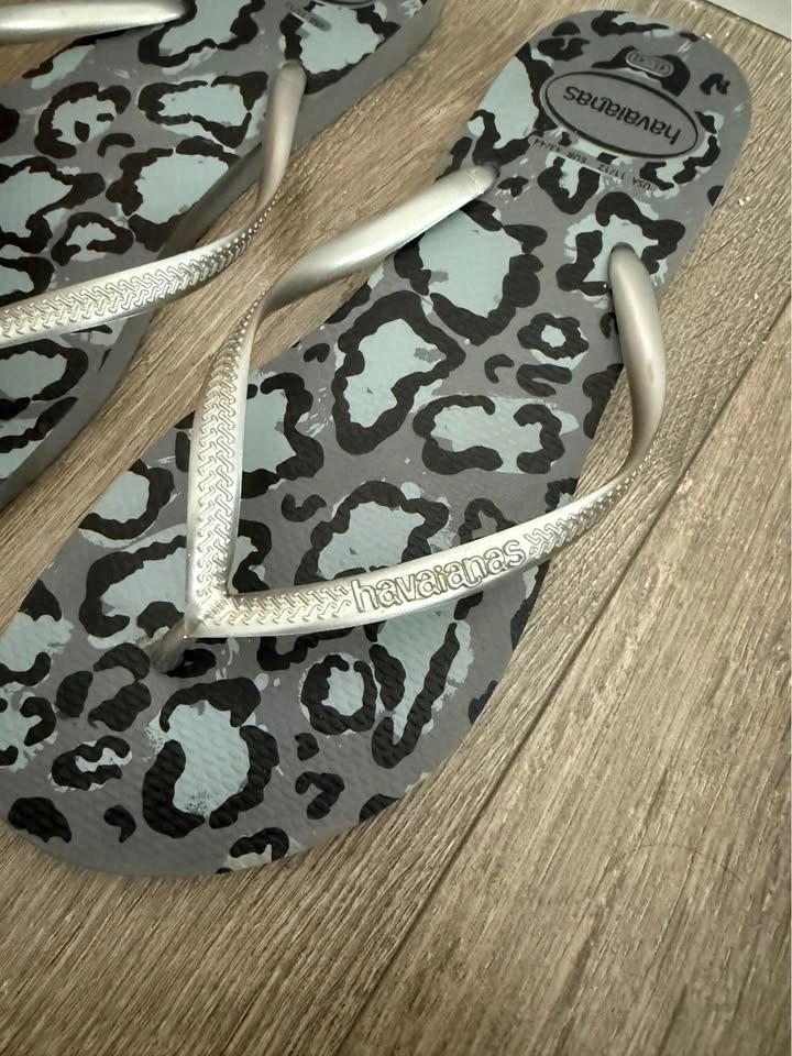 Havaianas leopard print flip flops with metallic silver straps — women’s size 11/12 (EUR 43/44). Only worn twice, excellent condition. Originally ~$30 CAD, priced low for a quick sale.