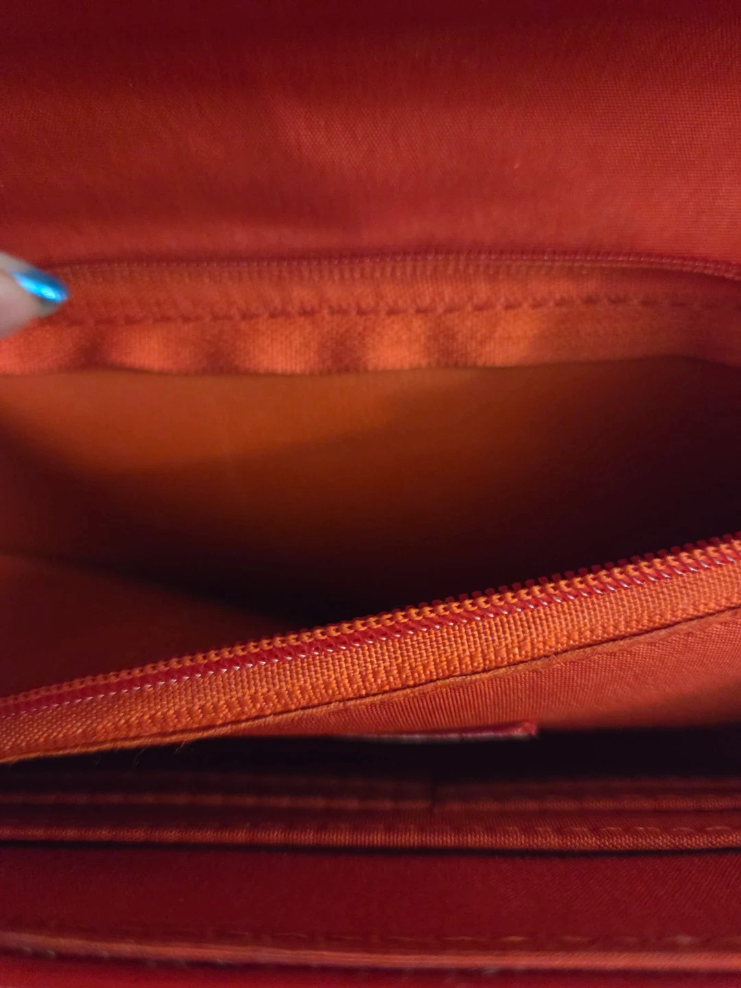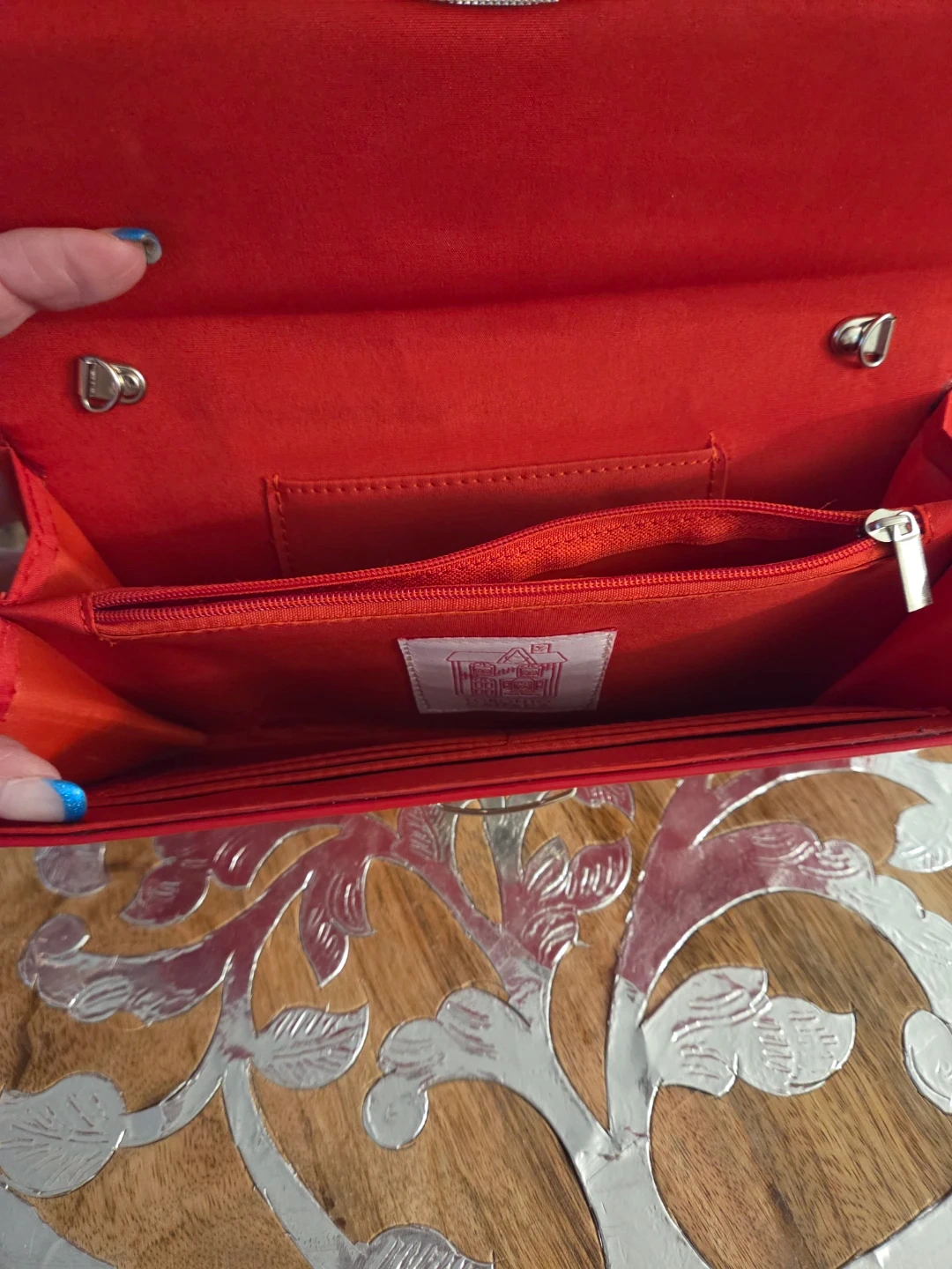 Here's a cute red clutch bag! It's perfect for a night out or a special occasion. The interior has a zippered pocket and a few other compartments to keep your belongings organized