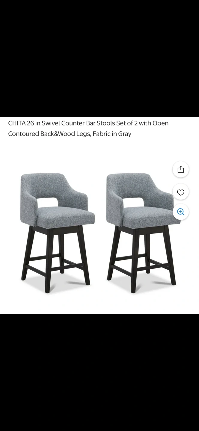 Brand new Selling a set of two CHITA swivel counter bar stools! They feature a contoured back and wood legs, with a fabric in gray. These stools are 26 inches in height, perfect for a counter or bar area. They're in great condition and ready for a new home!