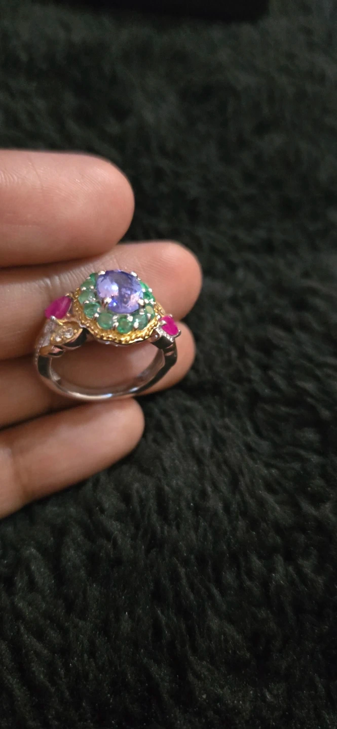 Selling a beautiful 2.30ctw gemstone ring in 18K YG and Rhodium over 925 Sterling Sliver. It features a purple center stone surrounded by green and pink stones. The ring is in brand new condition and comes with box.