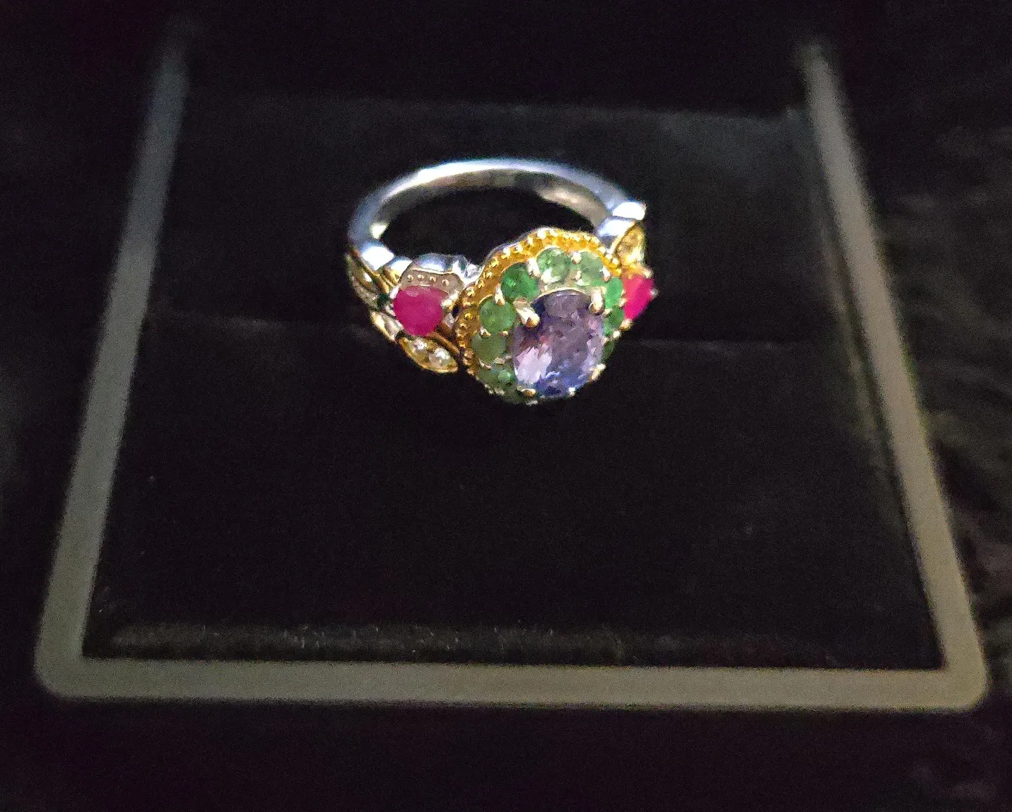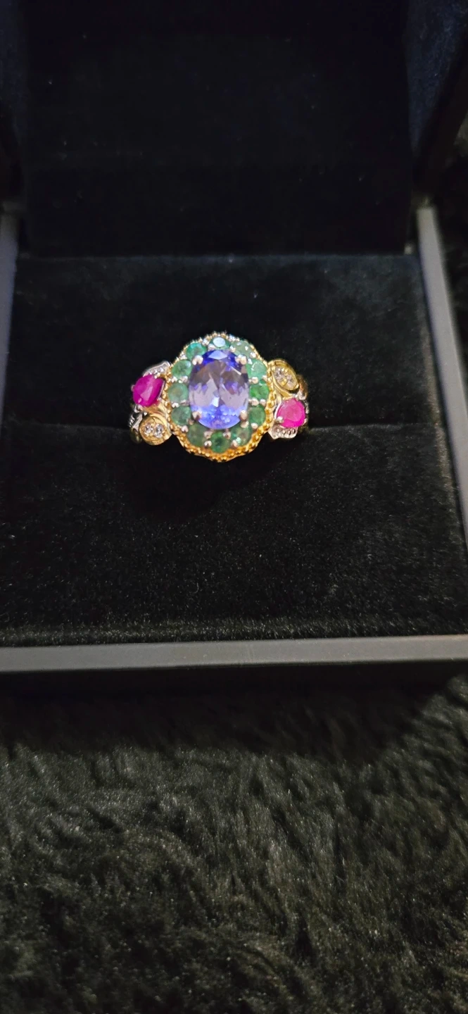 Selling a beautiful 2.30ctw gemstone ring in 18K YG and Rhodium over 925 Sterling Sliver. It features a purple center stone surrounded by green and pink stones. The ring is in brand new condition and comes with box.