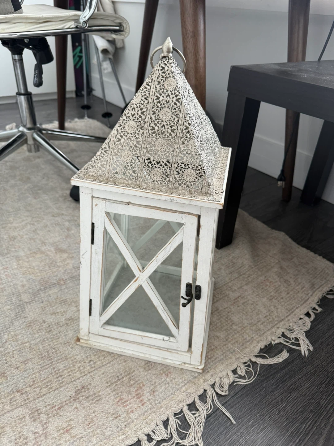 Selling a charming white decorative lantern. It has a rustic, vintage look that would add a cozy touch to any room. Perfect for creating a warm and inviting atmosphere in your home!