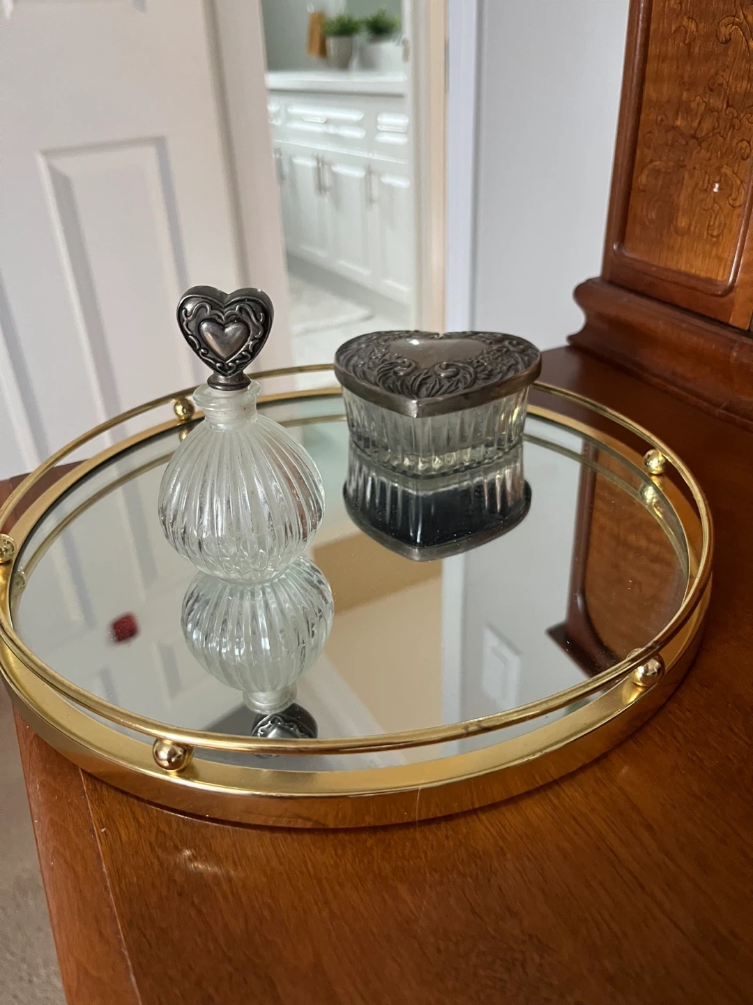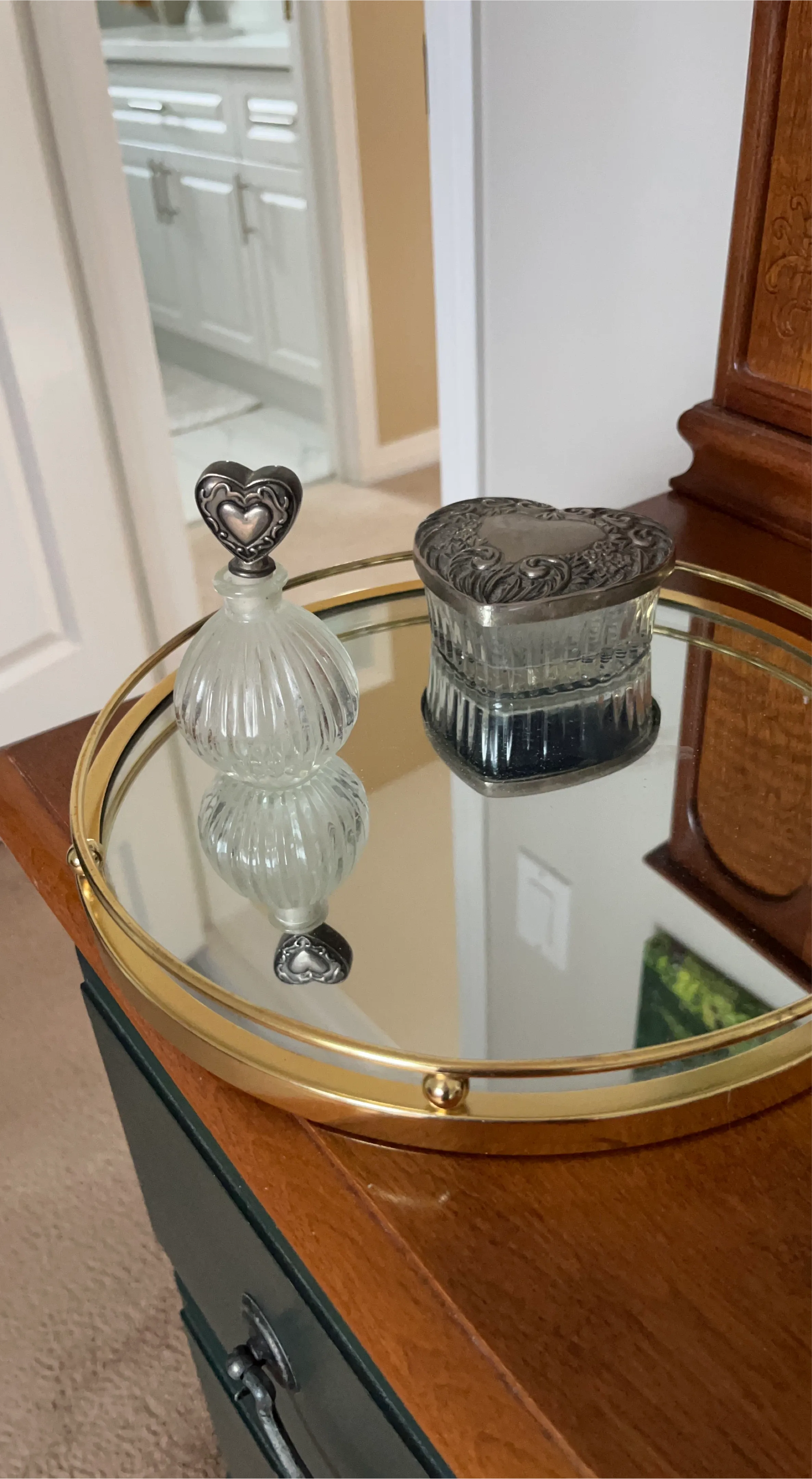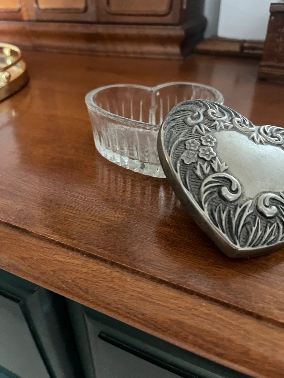 Selling a cute heart-shaped glass trinket box with a decorative silver-tone lid. It's in great condition and perfect for storing small jewellery or keepsakes