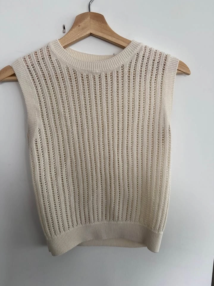 UNIQLO knit sweater vest, women’s size M — soft cream colour with breathable open-knit texture; sleeveless, lightweight, and perfect for layering. Original price approx. $40 selling for $15.