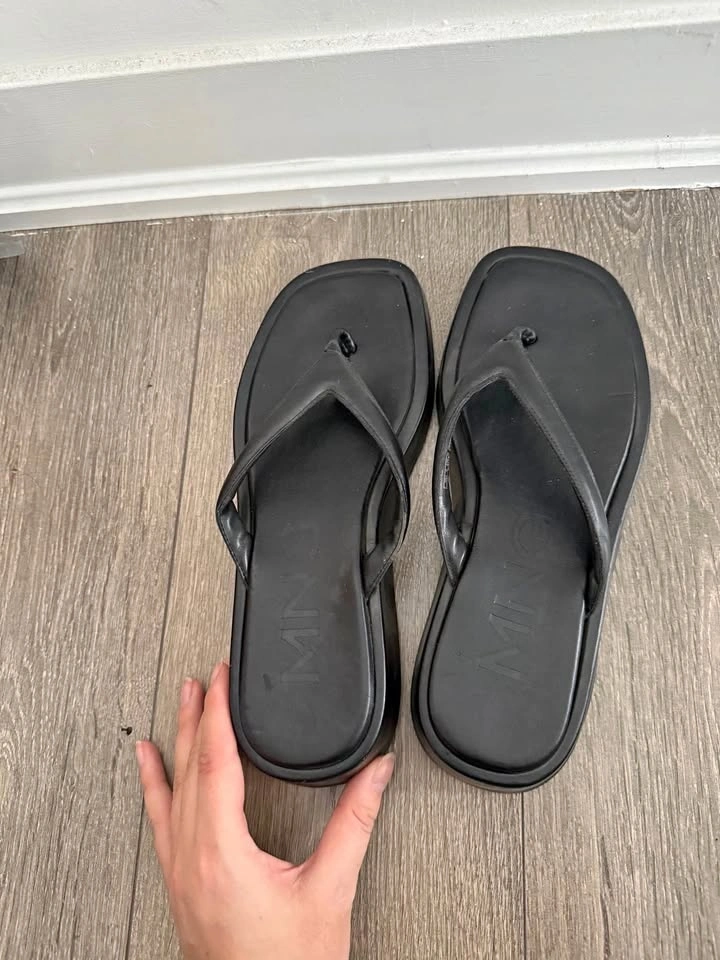 Mango black flip flops, women’s size 10 — minimalist square-toe style with cushioned footbed. Original price ~$45 CAD, lightly worn and well taken care of. Clean soles with minimal wear (see photos). Priced at $18.