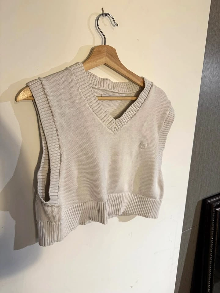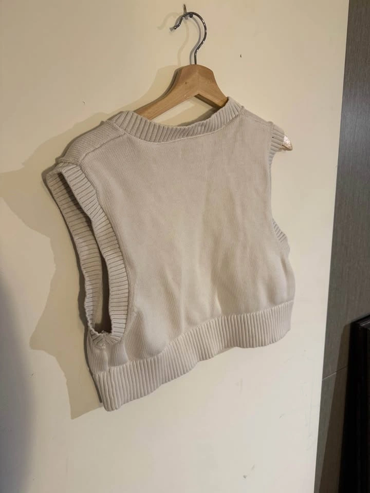 TNA knit sweater vest in a soft cream colour — size L. V-neck, ribbed hem and armholes, with subtle embroidered logo. Well taken care of, no noticeable flaws. Priced at $25 - originally 75$ CAD.