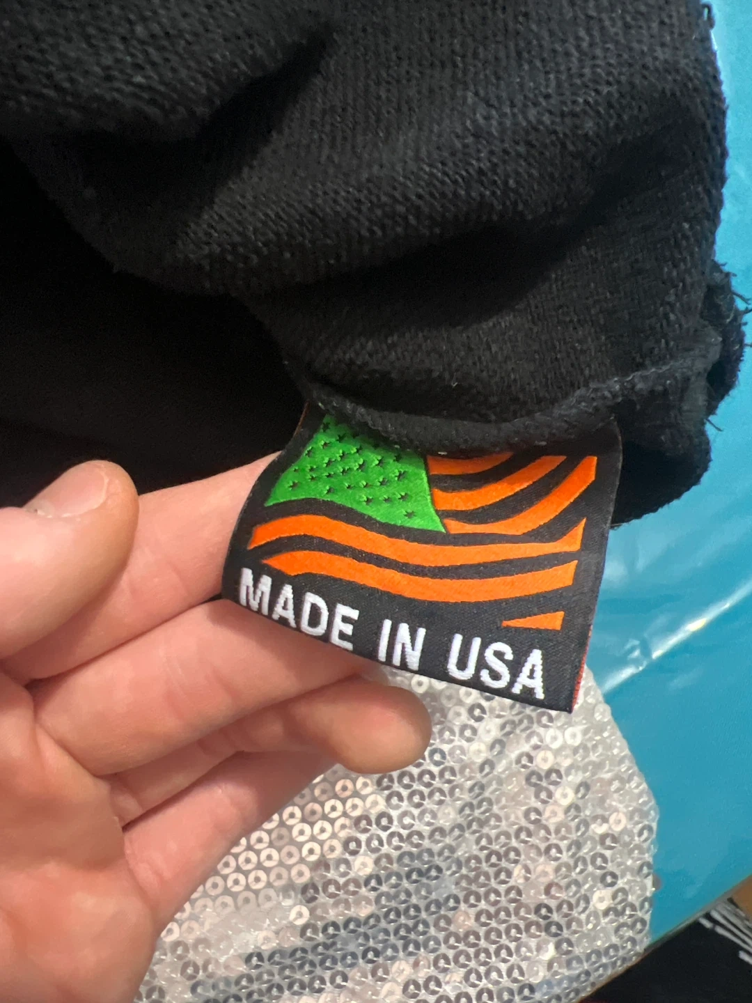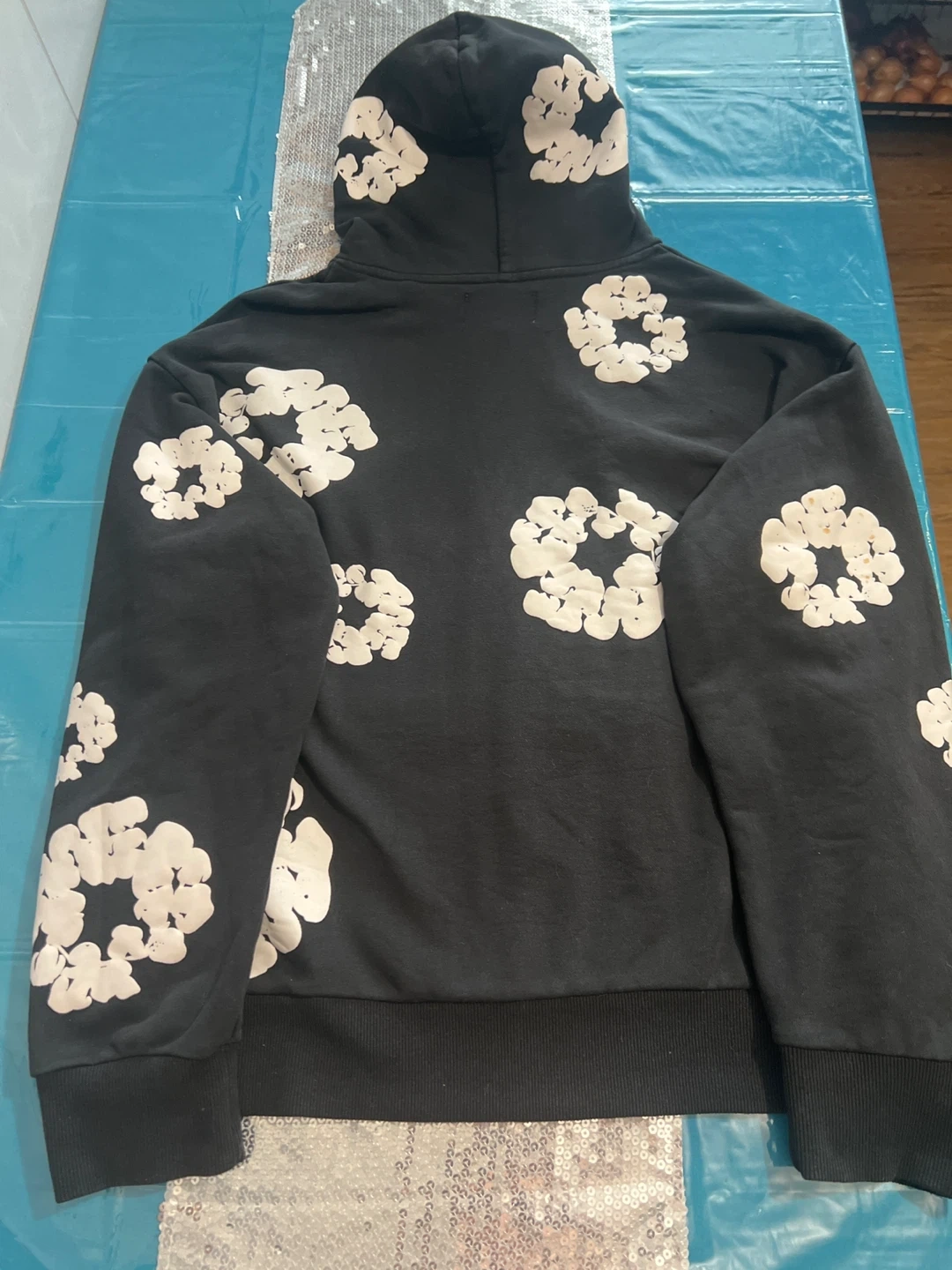 Selling a Denim Tears hoodie in black. It features a unique floral design and is a size M. The tag indicates it was made in the USA. It's in great shape! Only a stain on one of the flowers on the sleeve.