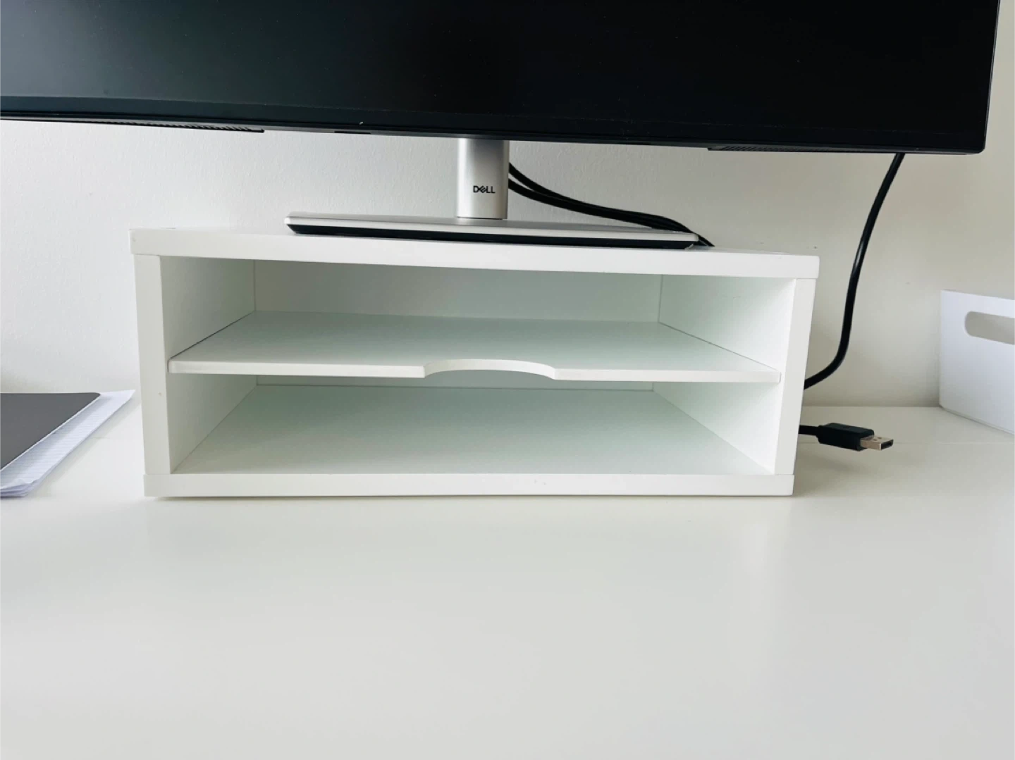 Selling a minimalistic white monitor stand with a shelf underneath. It's great for keeping your desk organized and raising your monitor to a comfortable viewing height. Perfect for a home office or study space! Made of wood and 15 cm height.