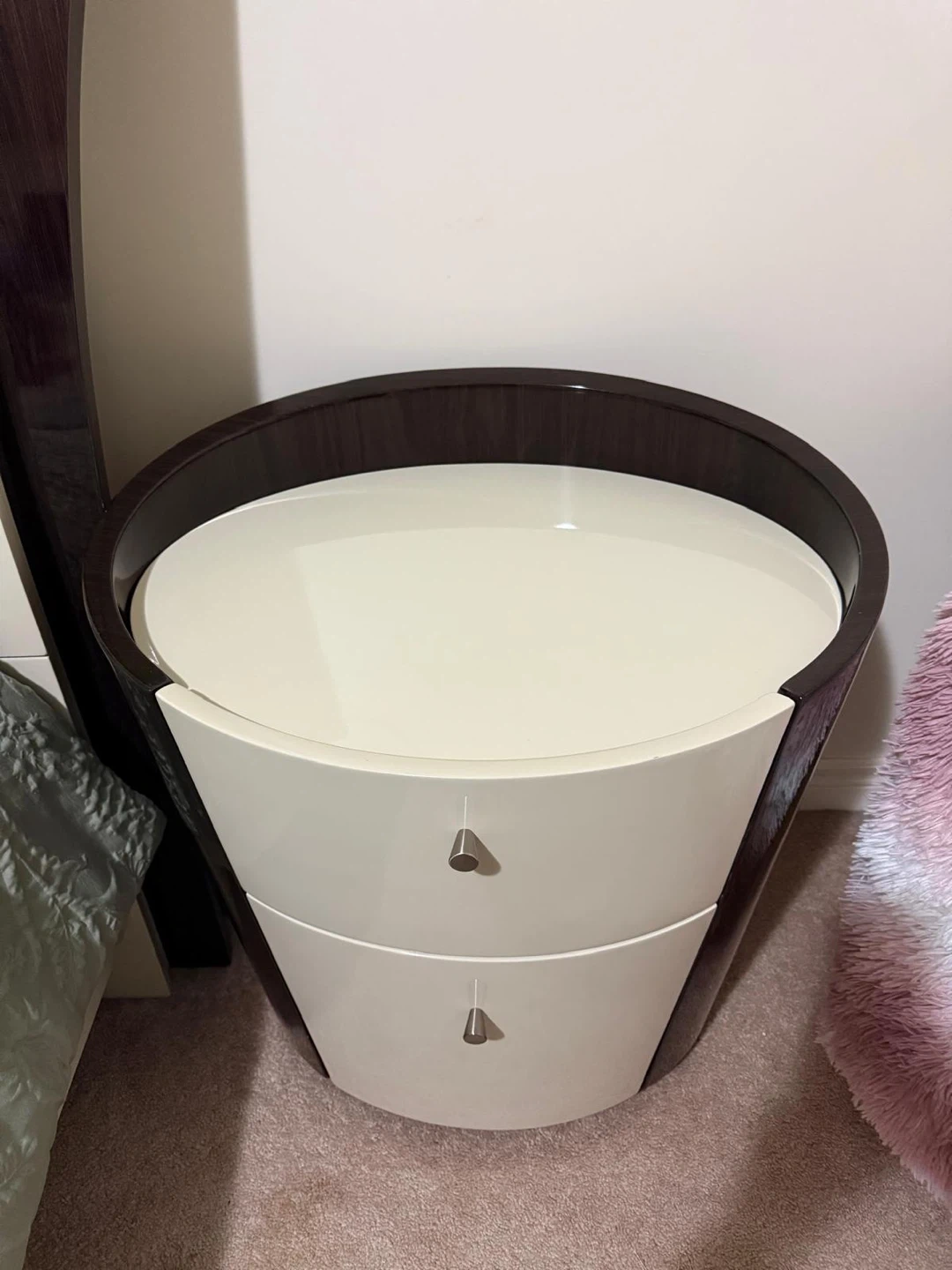 Selling a queen bedroom set of 5 pieces that includes a bed frame and a matching nightstand and dresser mirror. The bed frame features a unique headboard design with storage and the nightstand has two drawers for storage, and dresser mirror with 6 deep drawers. Great set for a bedroom!