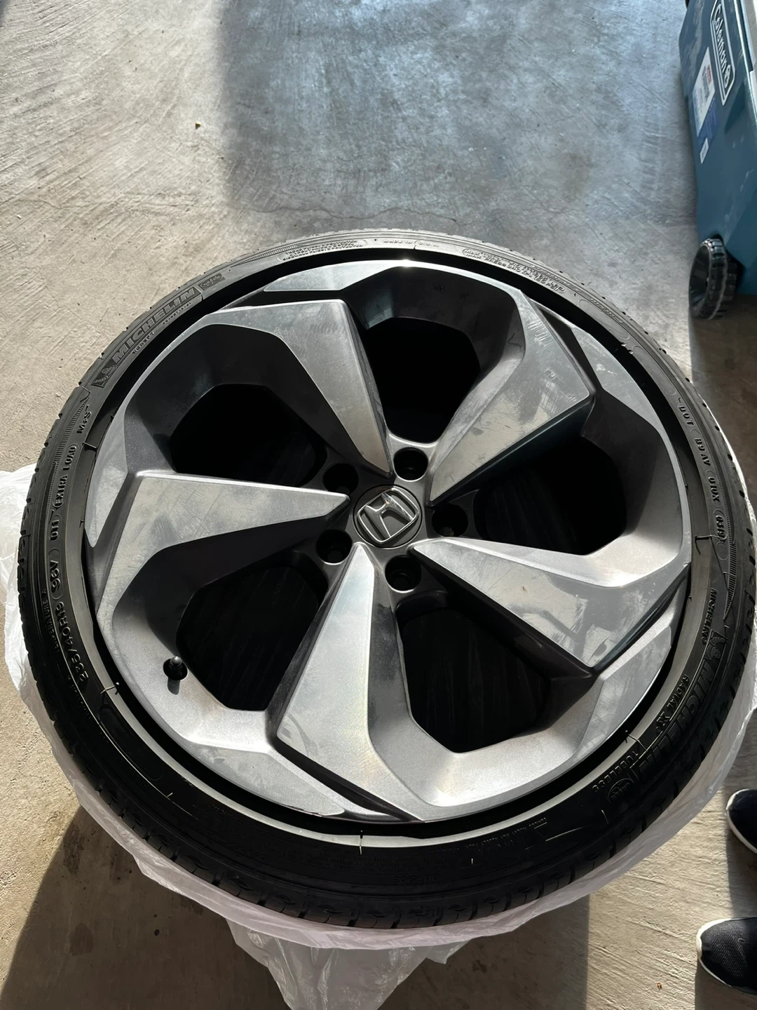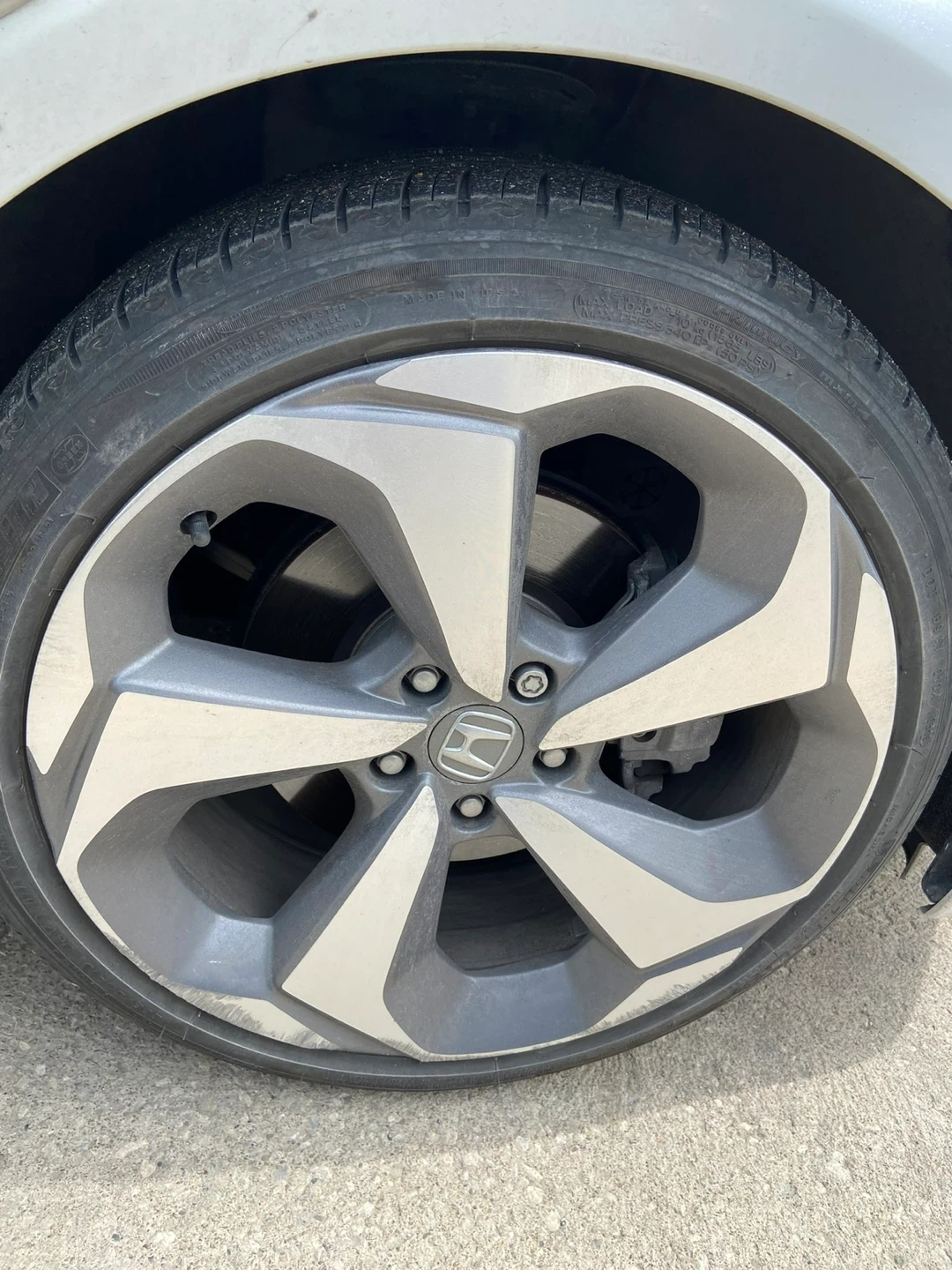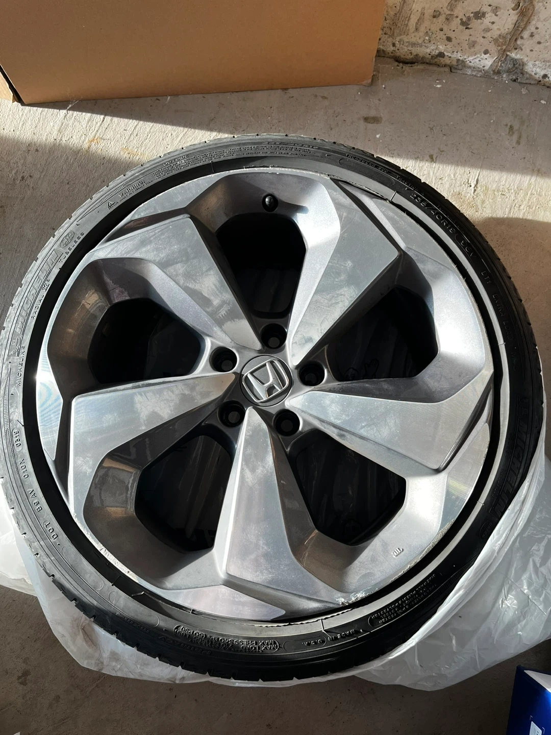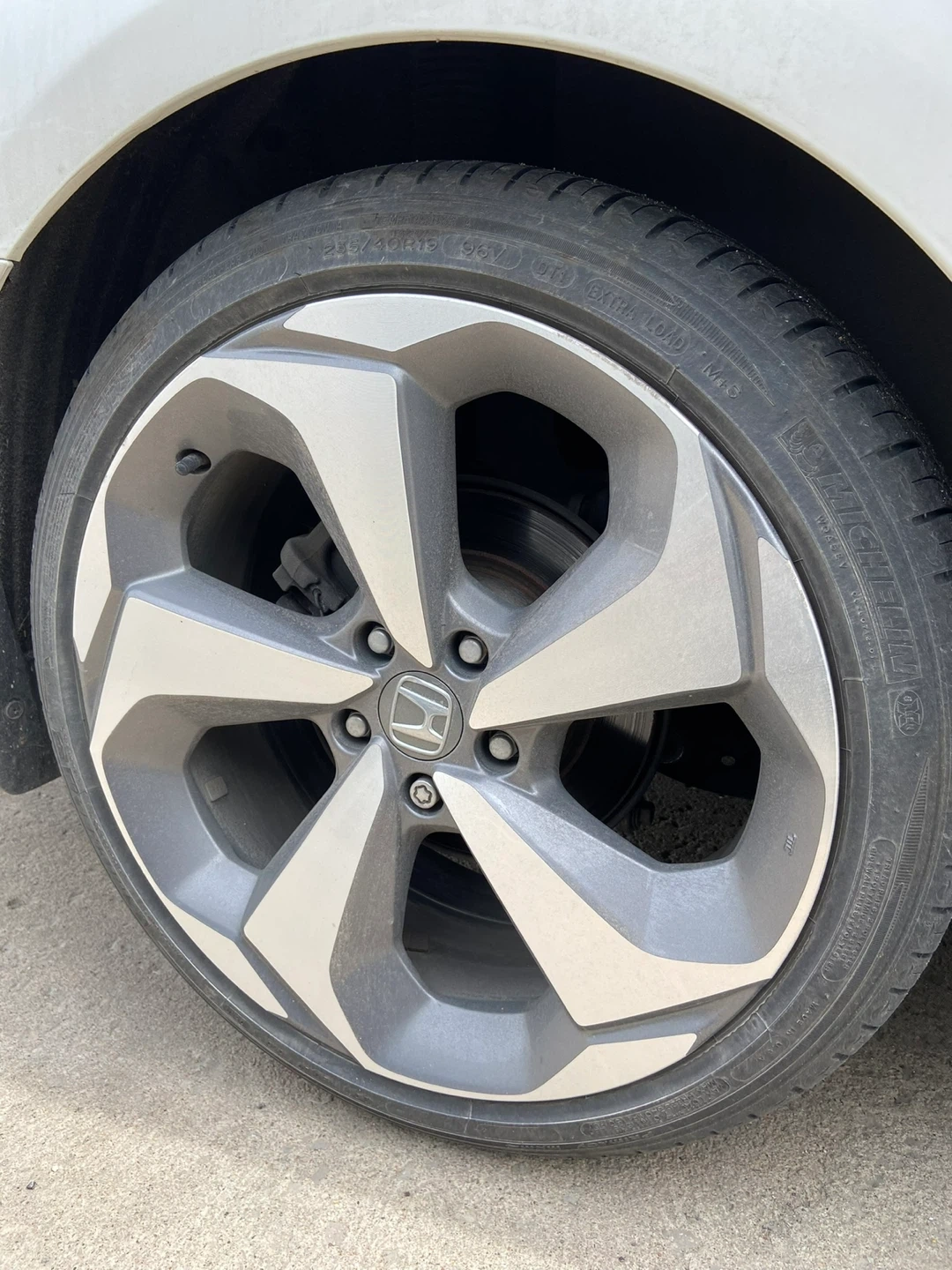 Selling (set of 4) 2019 Honda Accord OEM alloy wheel with Michelin all season tires. The tire size is 235/40R19 Bolt pattern 5x114.3. It has some curb rashes.