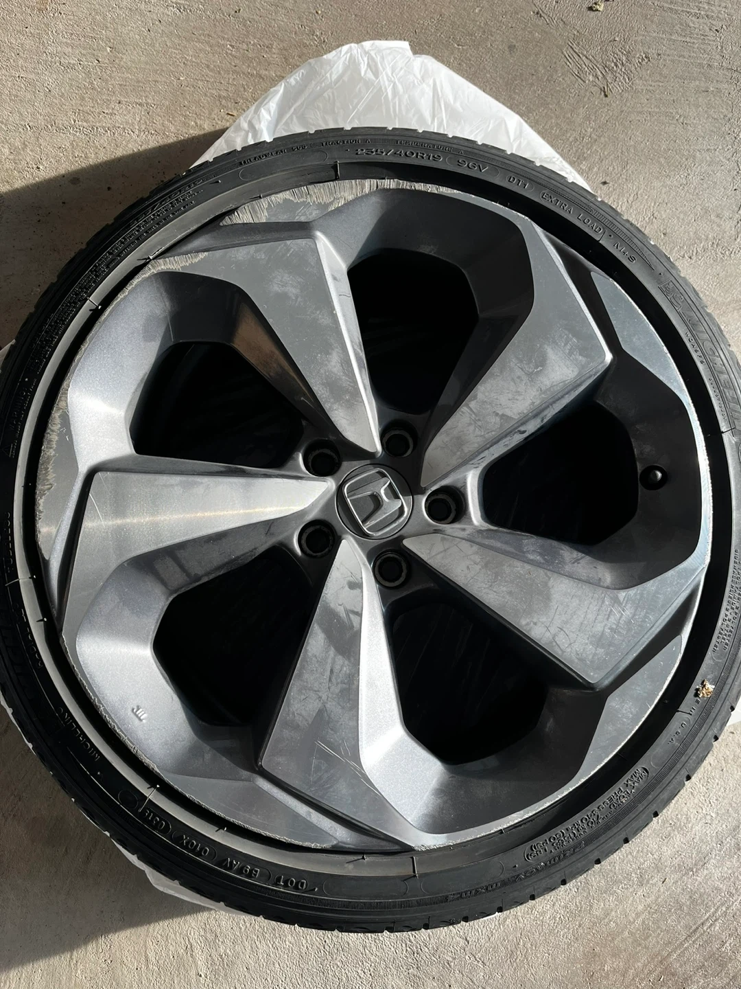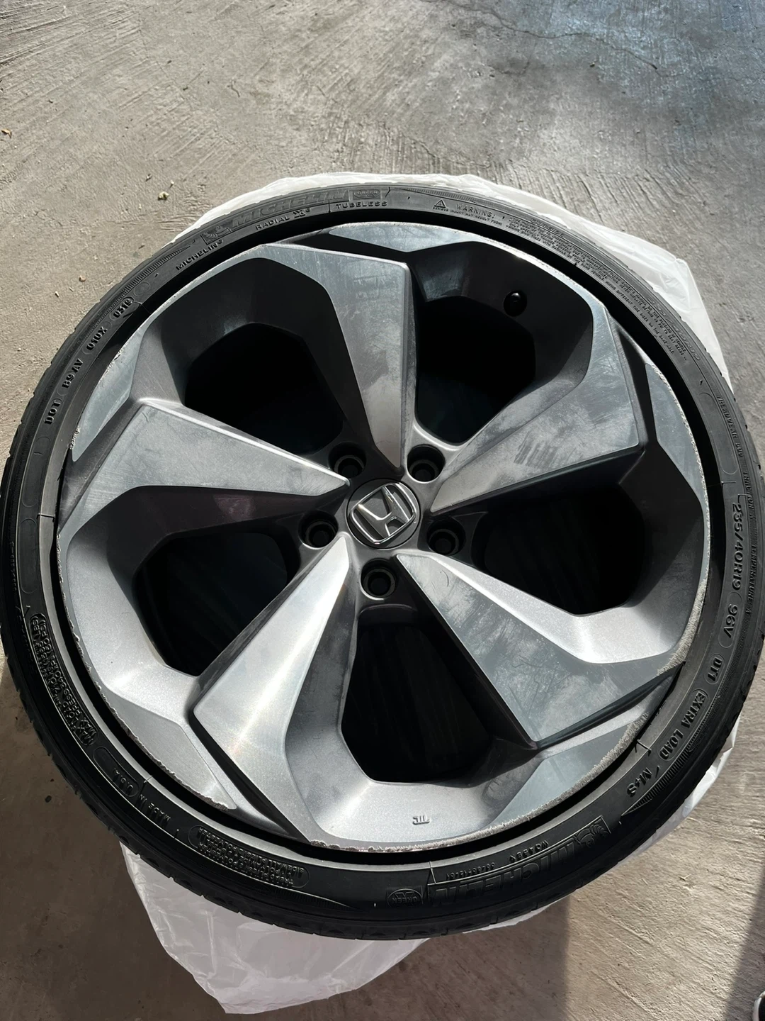 Selling (set of 4) 2019 Honda Accord OEM alloy wheel with Michelin all season tires. The tire size is 235/40R19 Bolt pattern 5x114.3. It has some curb rashes.