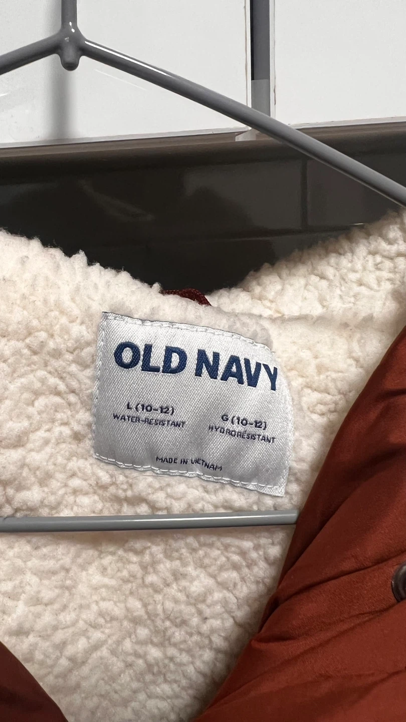 Cozy Old Navy puffer jacket, perfect for keeping warm! It's a size L (10-12) and features a sherpa-lined hood. The colour is a lovely reddish-brown. It's water-resistant too!