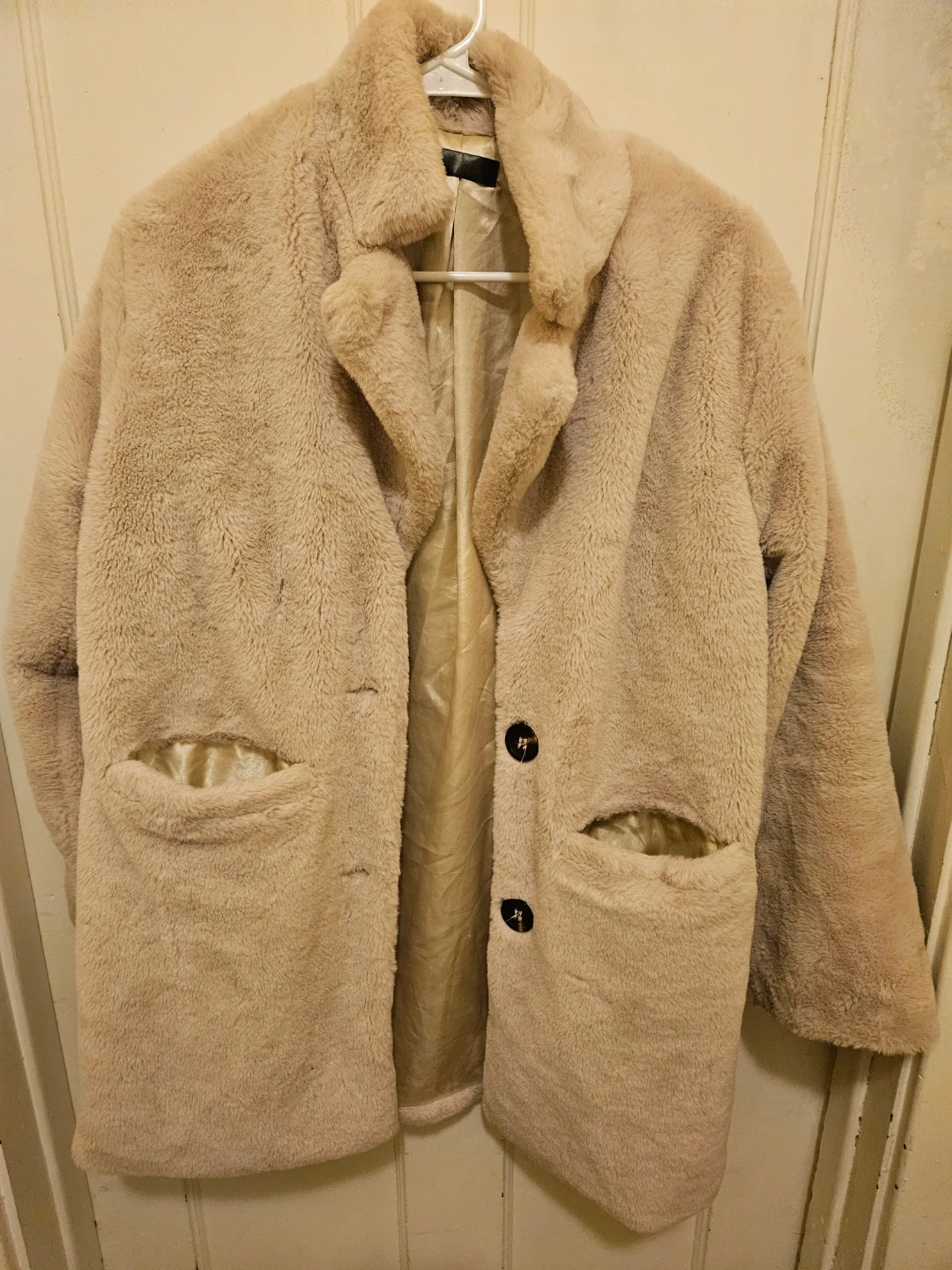 Selling a cozy faux fur coat from Janice Apparel! It's a one-size-fits-all and made from 100% polyester. It is 31 inches long. The coat is a soft, neutral color and has a smooth lining. Perfect for adding a touch of warmth and style to any outfit!