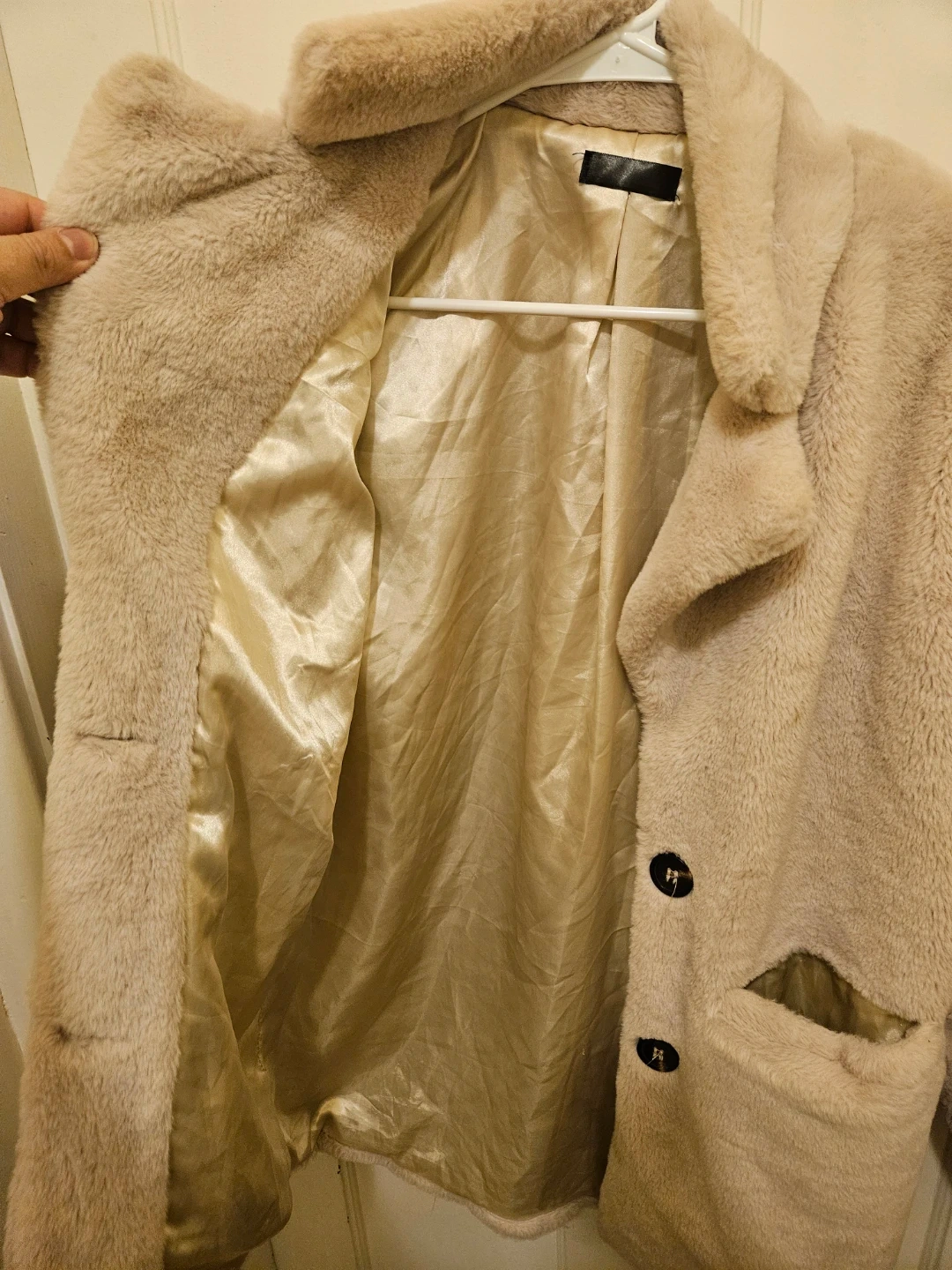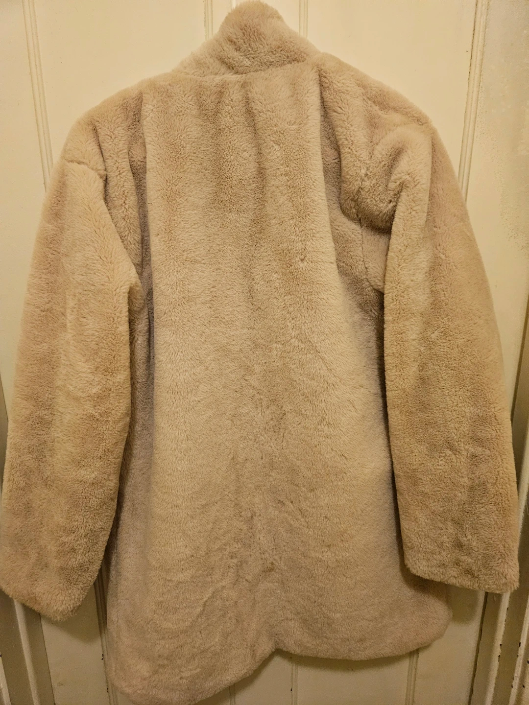Selling a cozy faux fur coat from Janice Apparel! It's a one-size-fits-all and made from 100% polyester. It is 31 inches long. The coat is a soft, neutral color and has a smooth lining. Perfect for adding a touch of warmth and style to any outfit!