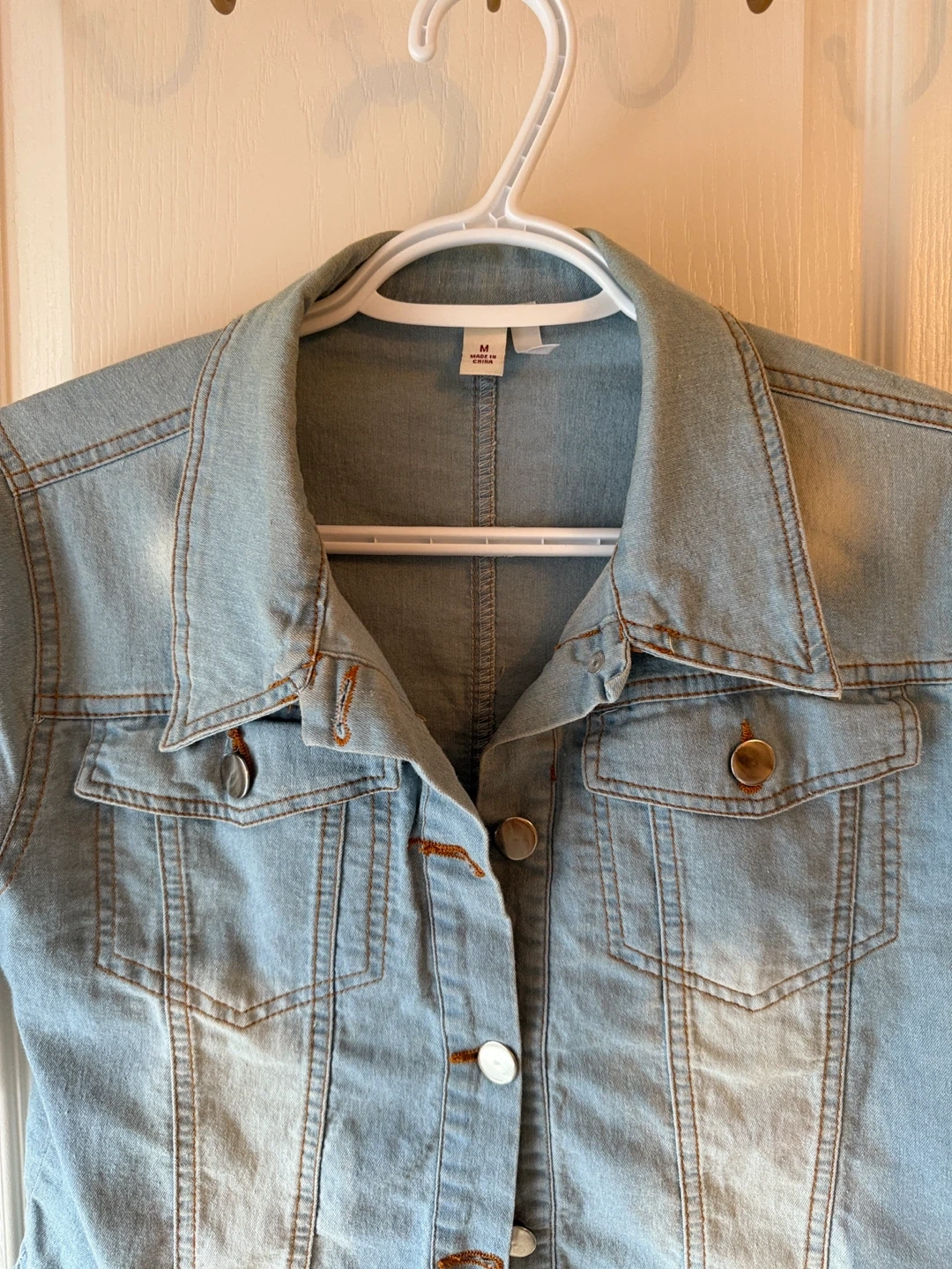 Soft denim jacket. It's a light wash denim with ruffle detailing on the sleeves and bottom.