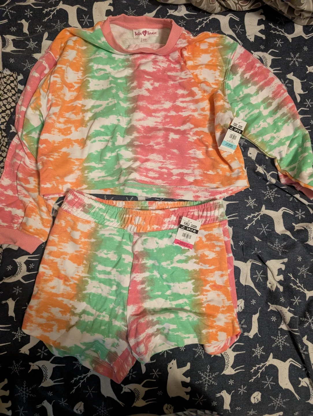 Cute Bella Birdie tie-dye matching set! This includes a long-sleeve cropped top and shorts. Size is S (7-8). Brand new with tag. Asking $5 for the set