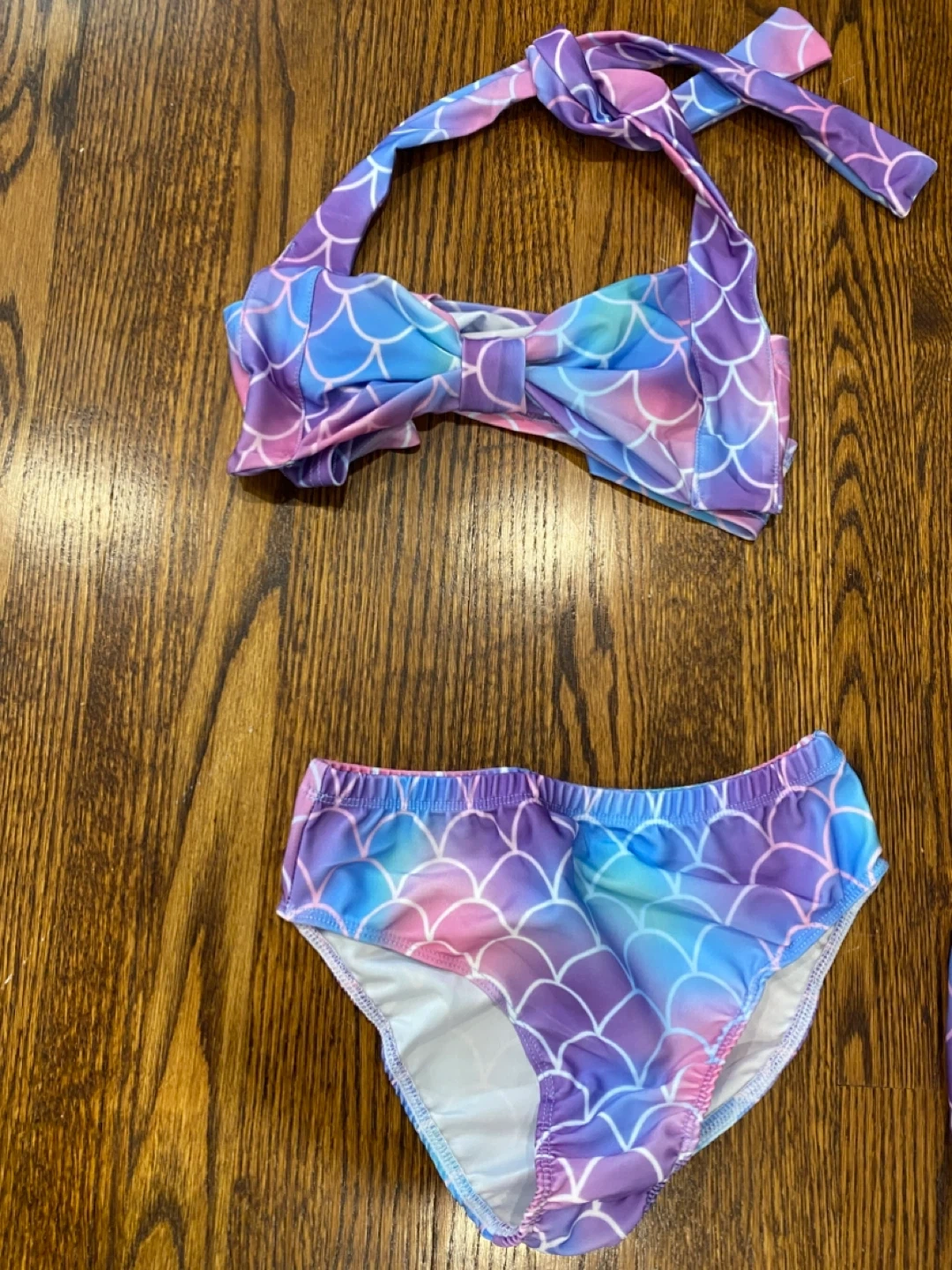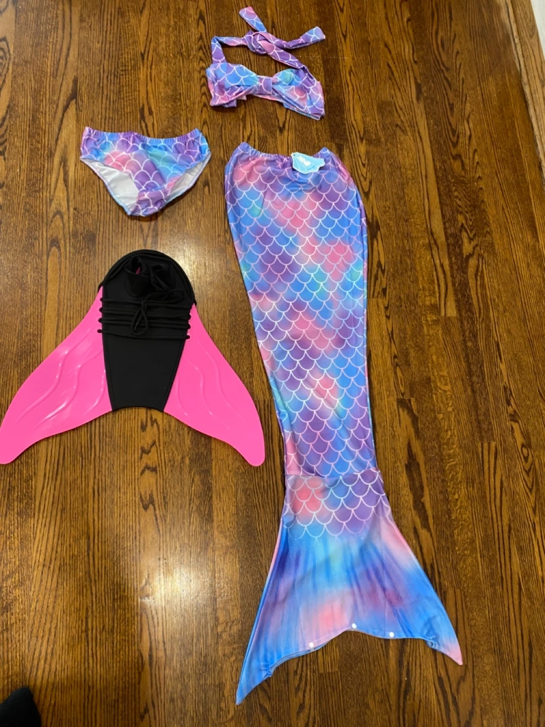 Selling a cute mermaid tail swimsuit set from Fin Fun! It includes the mermaid tail, bikini top, bikini bottom, and monofin. Perfect for some fun in the water. Ideal fit for ages 7-10 yrs old.