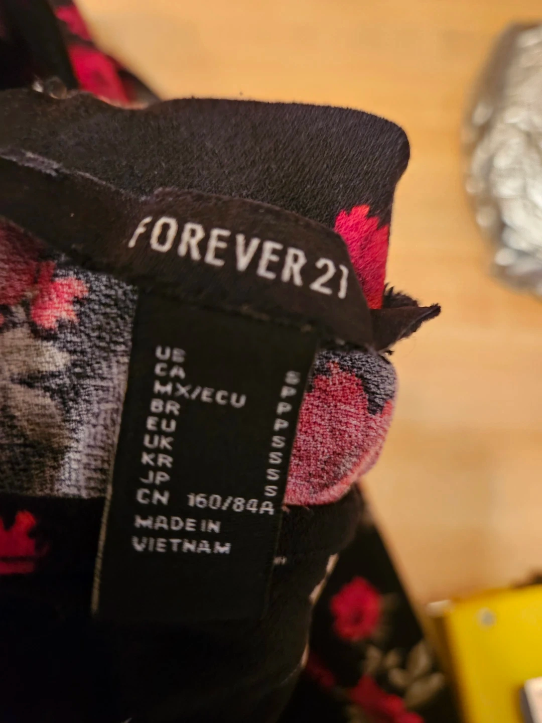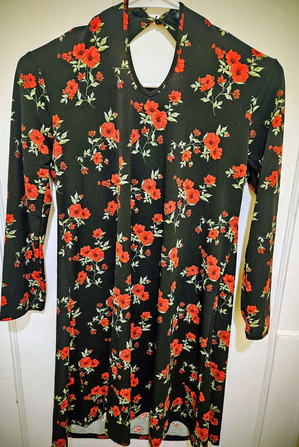 Cute Forever 21 dress with a black background and a vibrant red floral print. It's a size small and features long sleeves. Perfect for a casual day out or a fun evening!