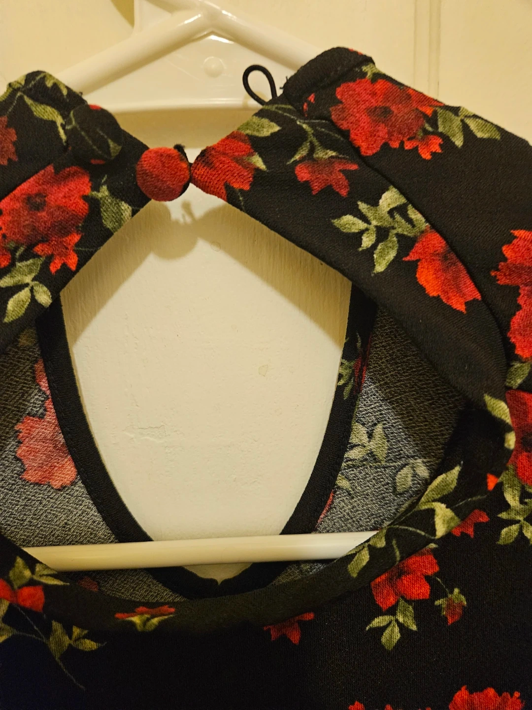 Cute Forever 21 dress with a black background and a vibrant red floral print. It's a size small and features long sleeves. Perfect for a casual day out or a fun evening!