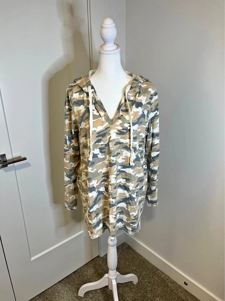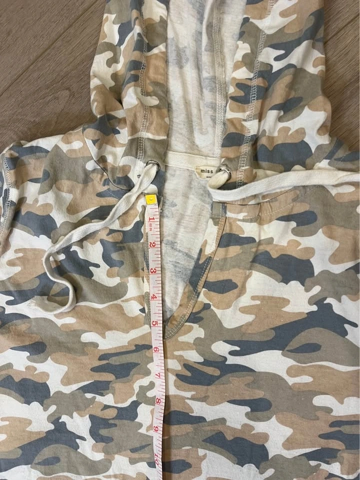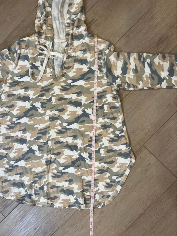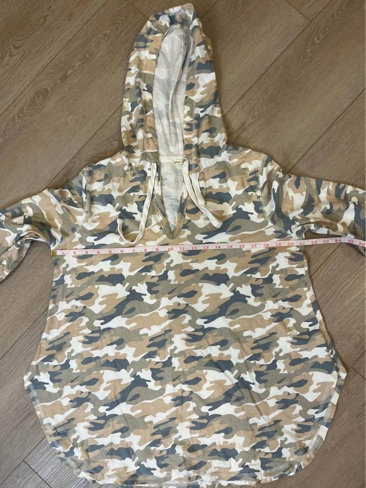 Soft neutral camo print hooded pullover from MISS LOVE. Features a drawstring hood and V-neck. Relaxed fit with long sleeves. Made of 100% cotton. Size M.