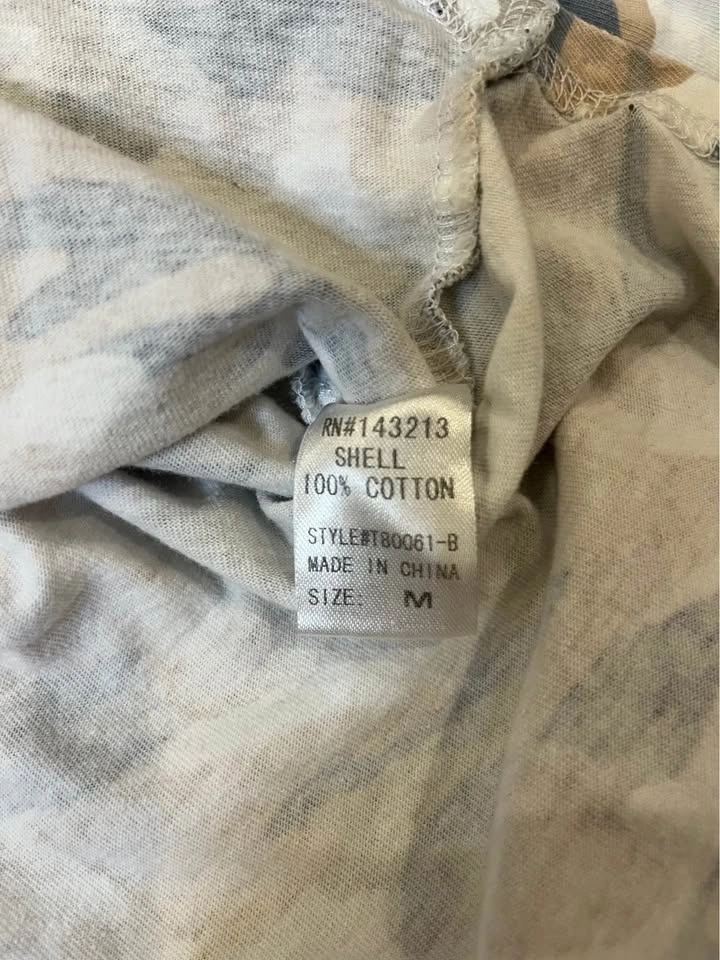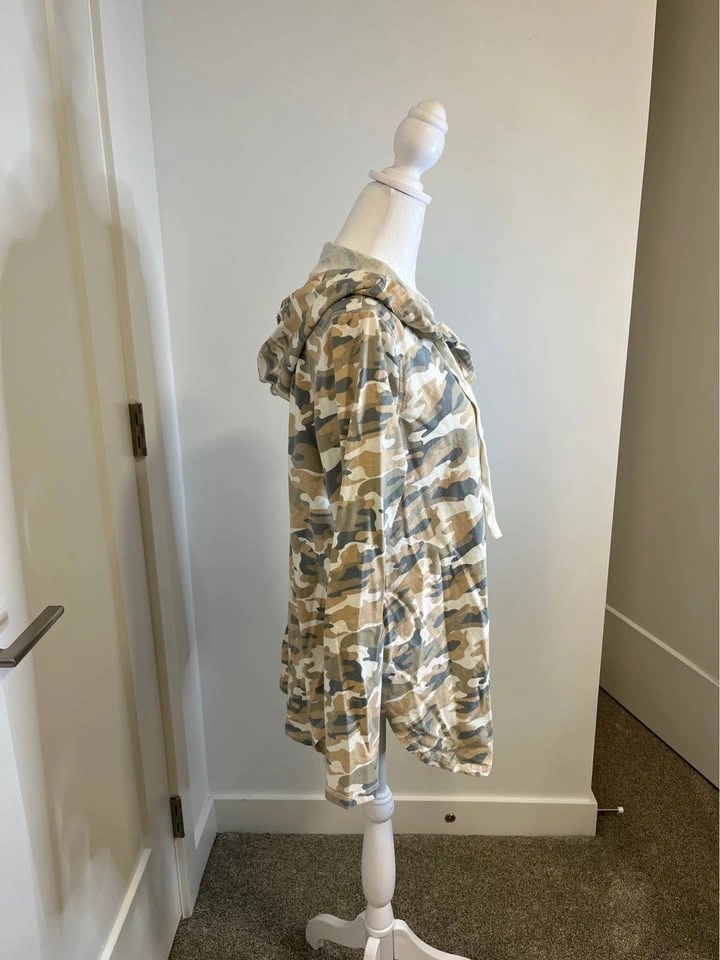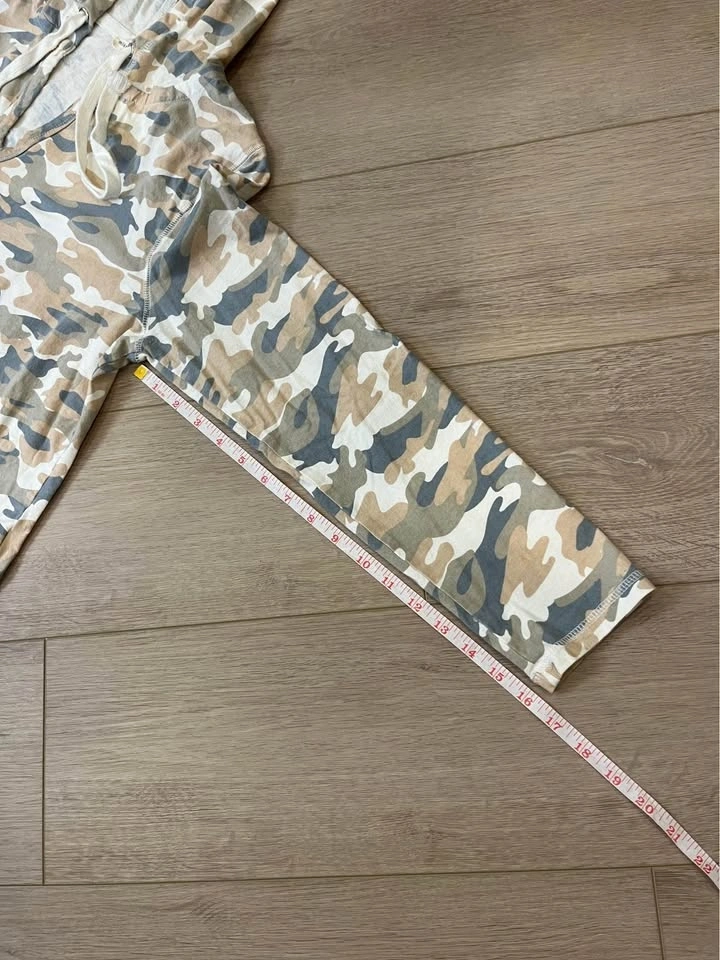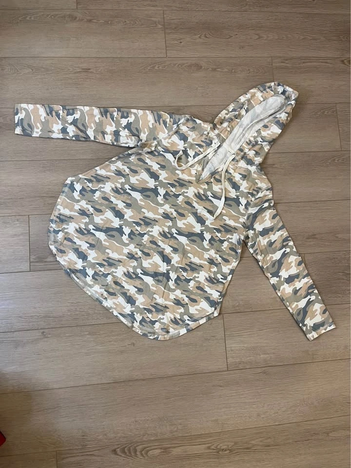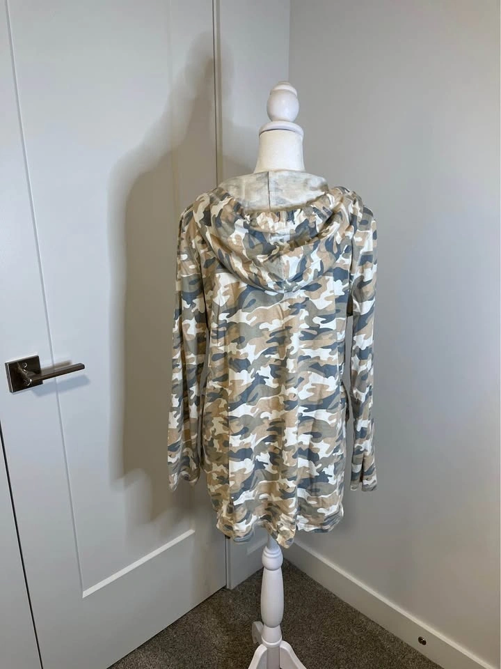 Soft neutral camo print hooded pullover from MISS LOVE. Features a drawstring hood and V-neck. Relaxed fit with long sleeves. Made of 100% cotton. Size M.