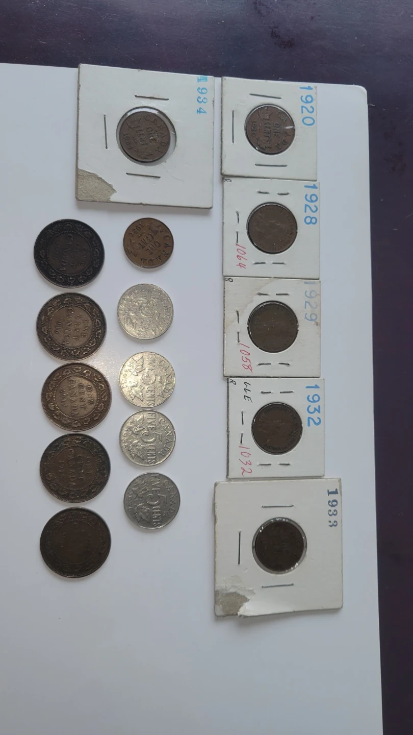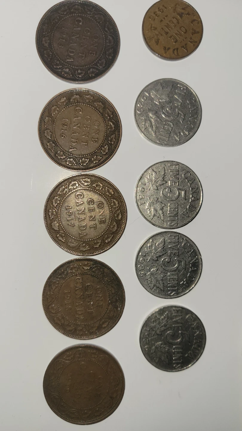 Selling a collection of vintage Canadian coins. Includes pennies from 1916 to 1934 and five-cent pieces from the same era. A great addition to any coin collection!