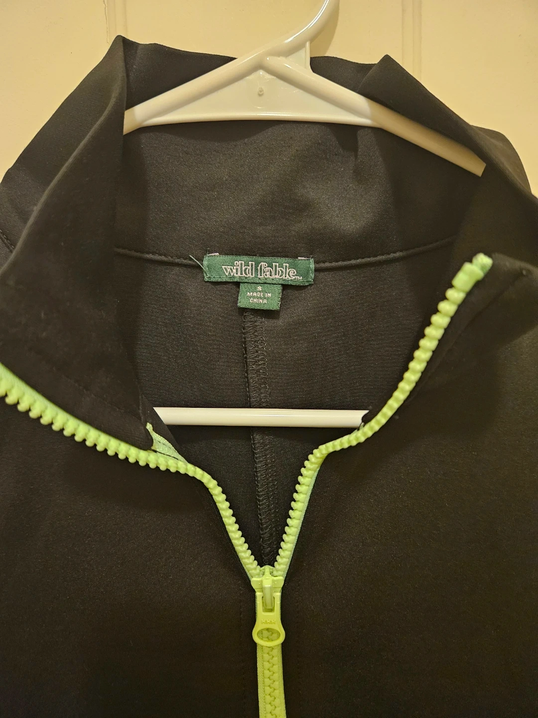 This is a Wild Fable black sleeveless mini dress. It's made of 93% polyester and 7% spandex. It has a neon green zipper and a mock neck. It's machine washable, gentle cycle, and tumble dry low