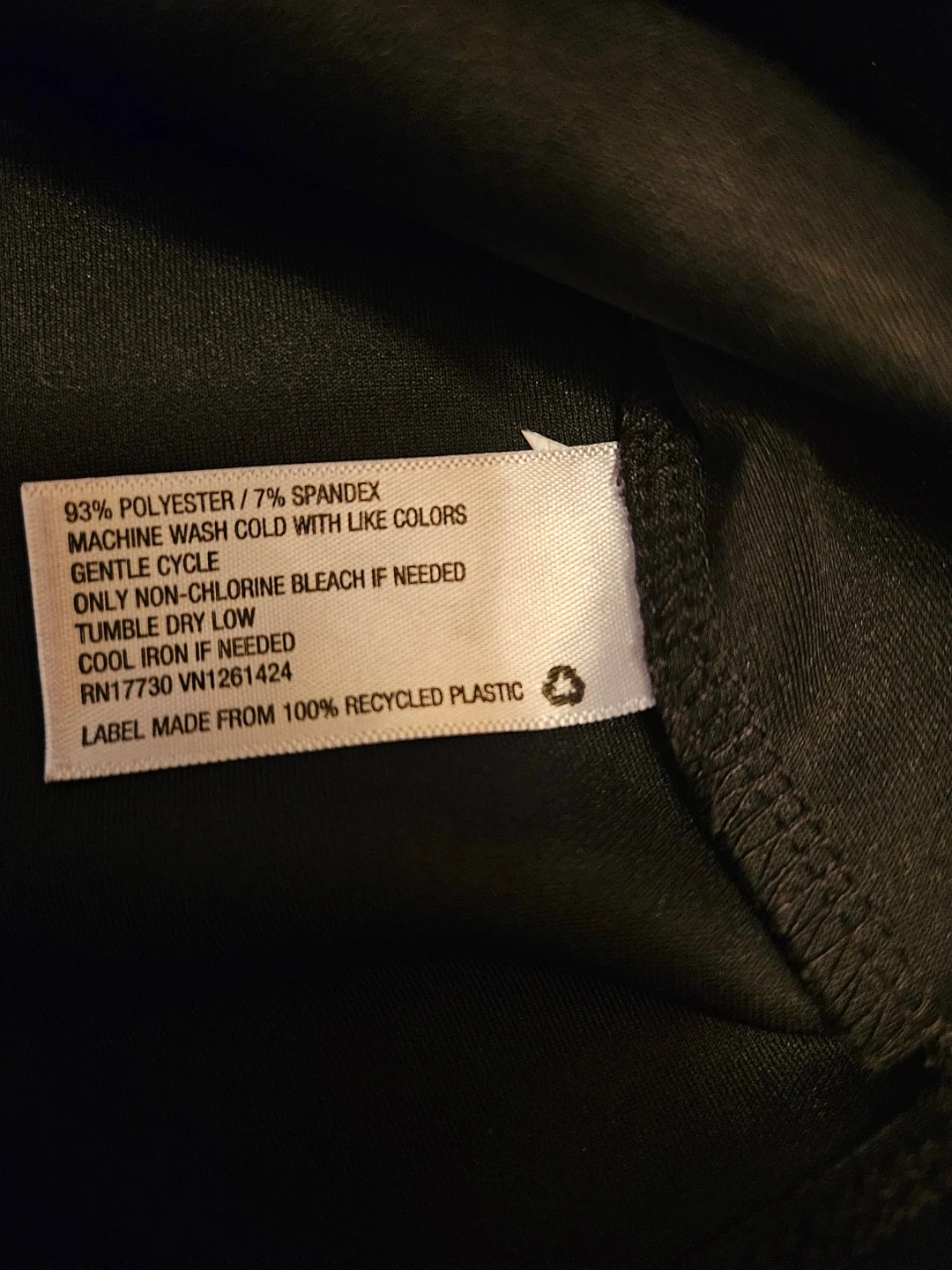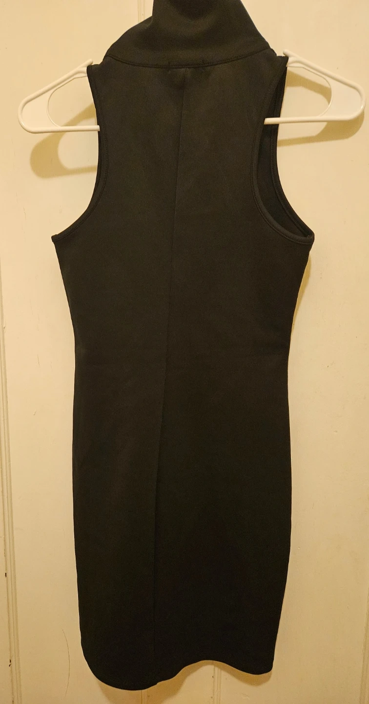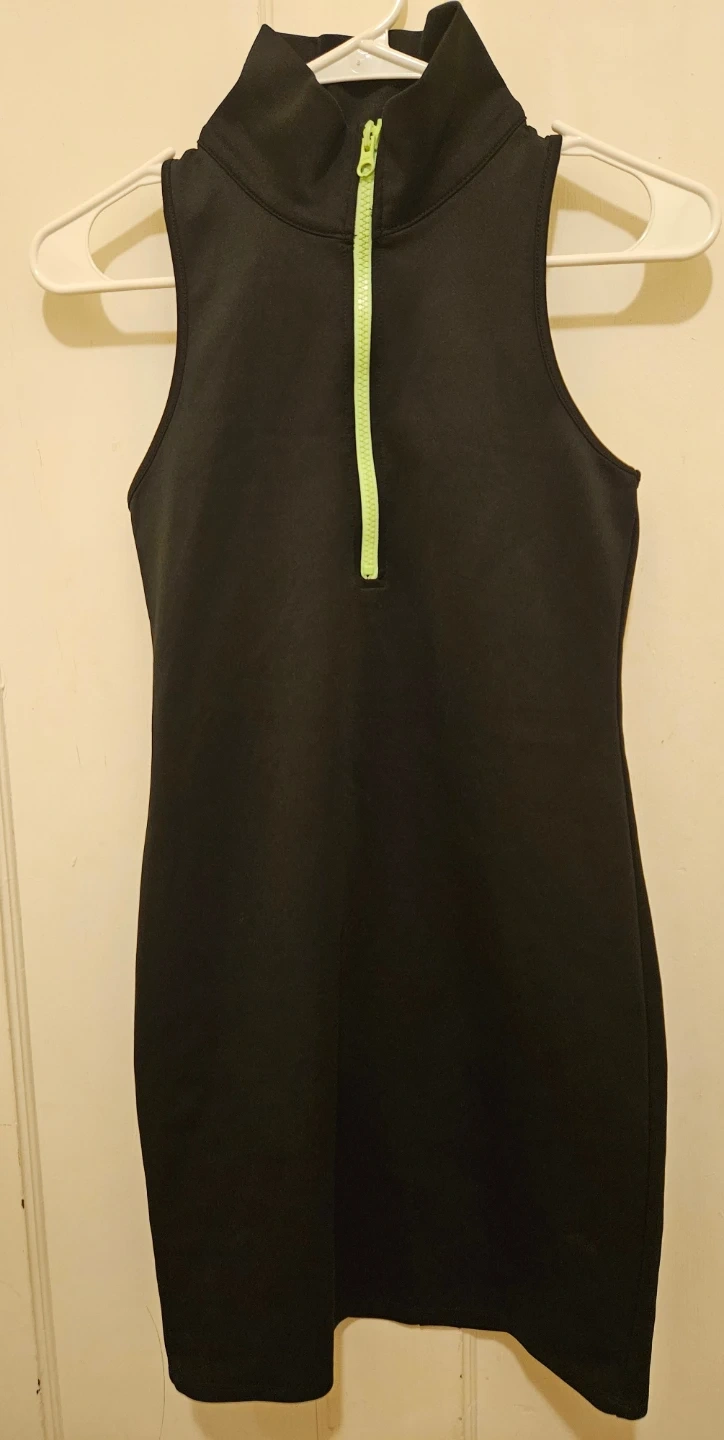 This is a Wild Fable black sleeveless mini dress. It's made of 93% polyester and 7% spandex. It has a neon green zipper and a mock neck. It's machine washable, gentle cycle, and tumble dry low