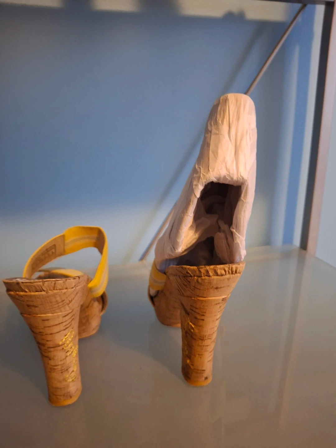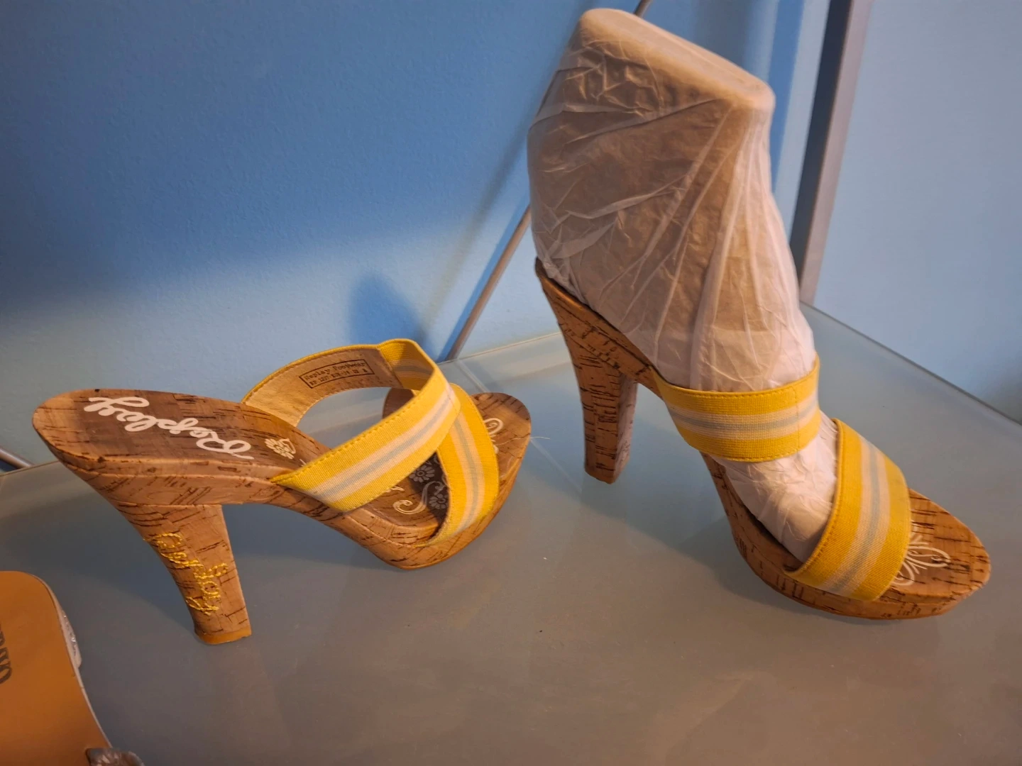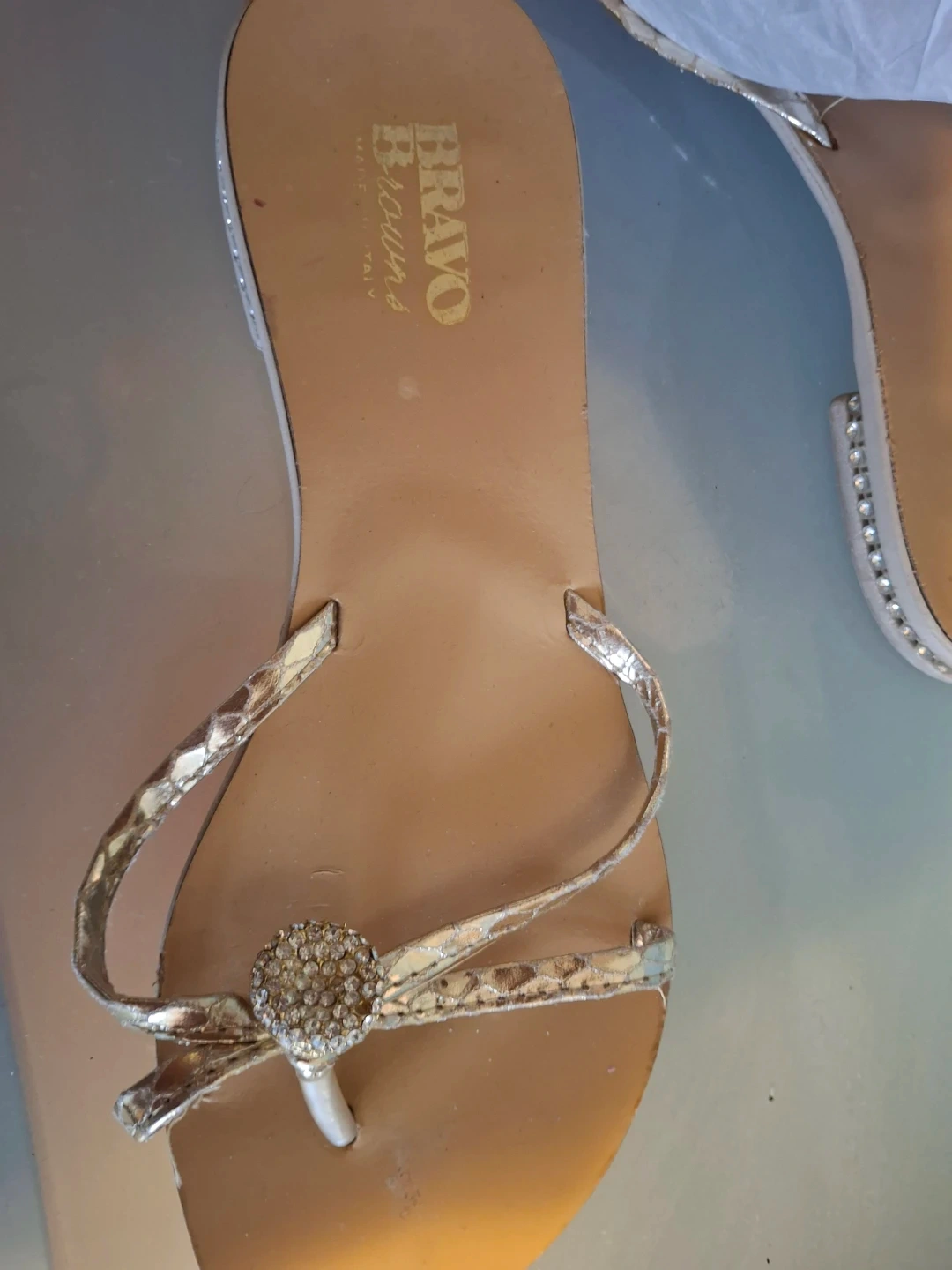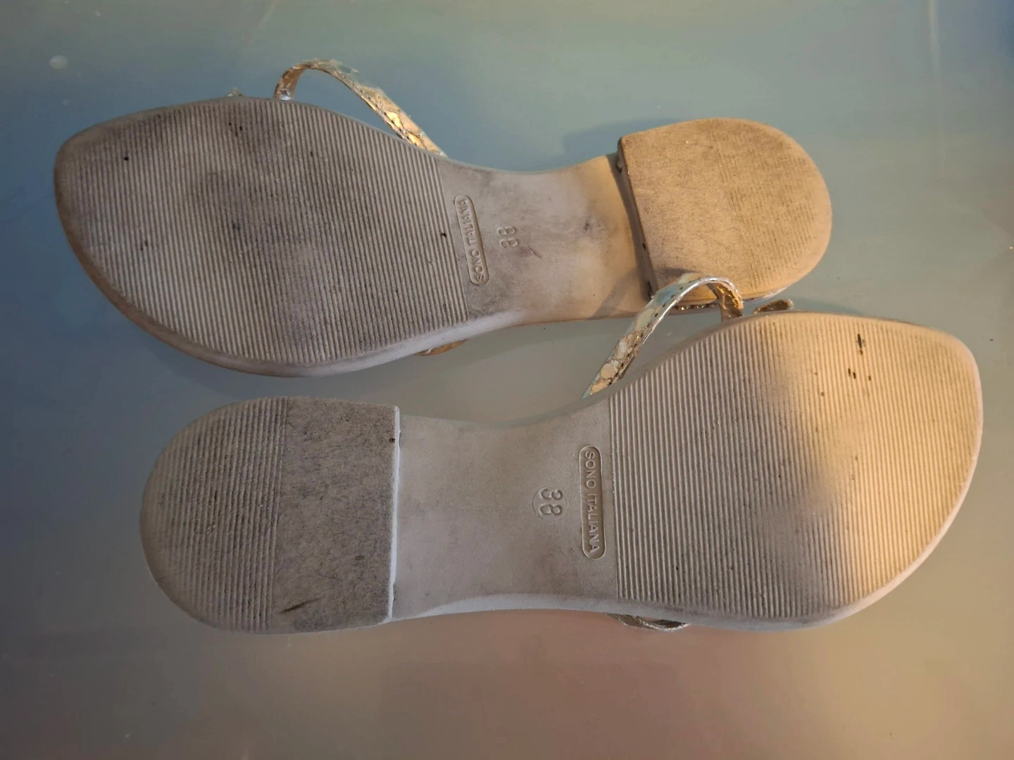 Cute pair of Replay heeled sandals in a size 38! They feature a cork-like material and yellow straps. Bravo Browns flat sandals with gold embellishment on straps and heels. Selling both for $45!