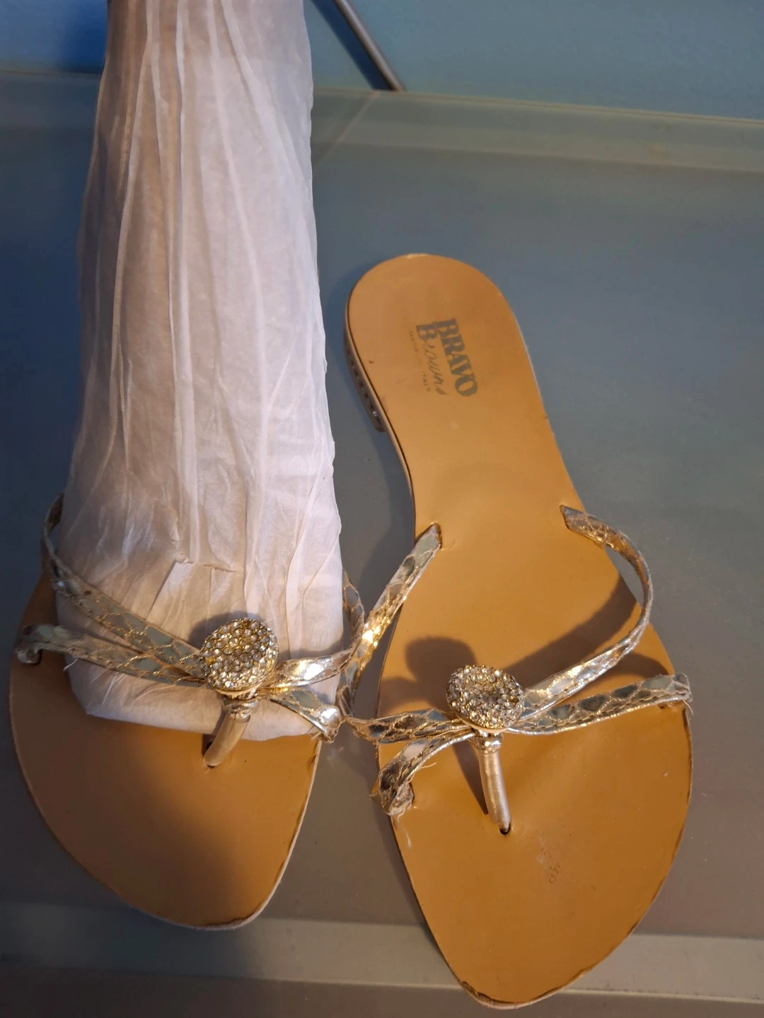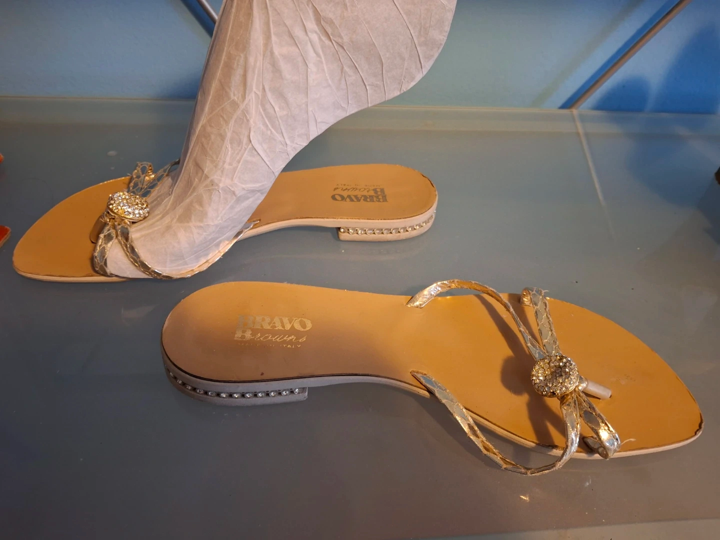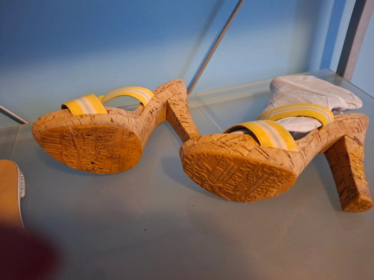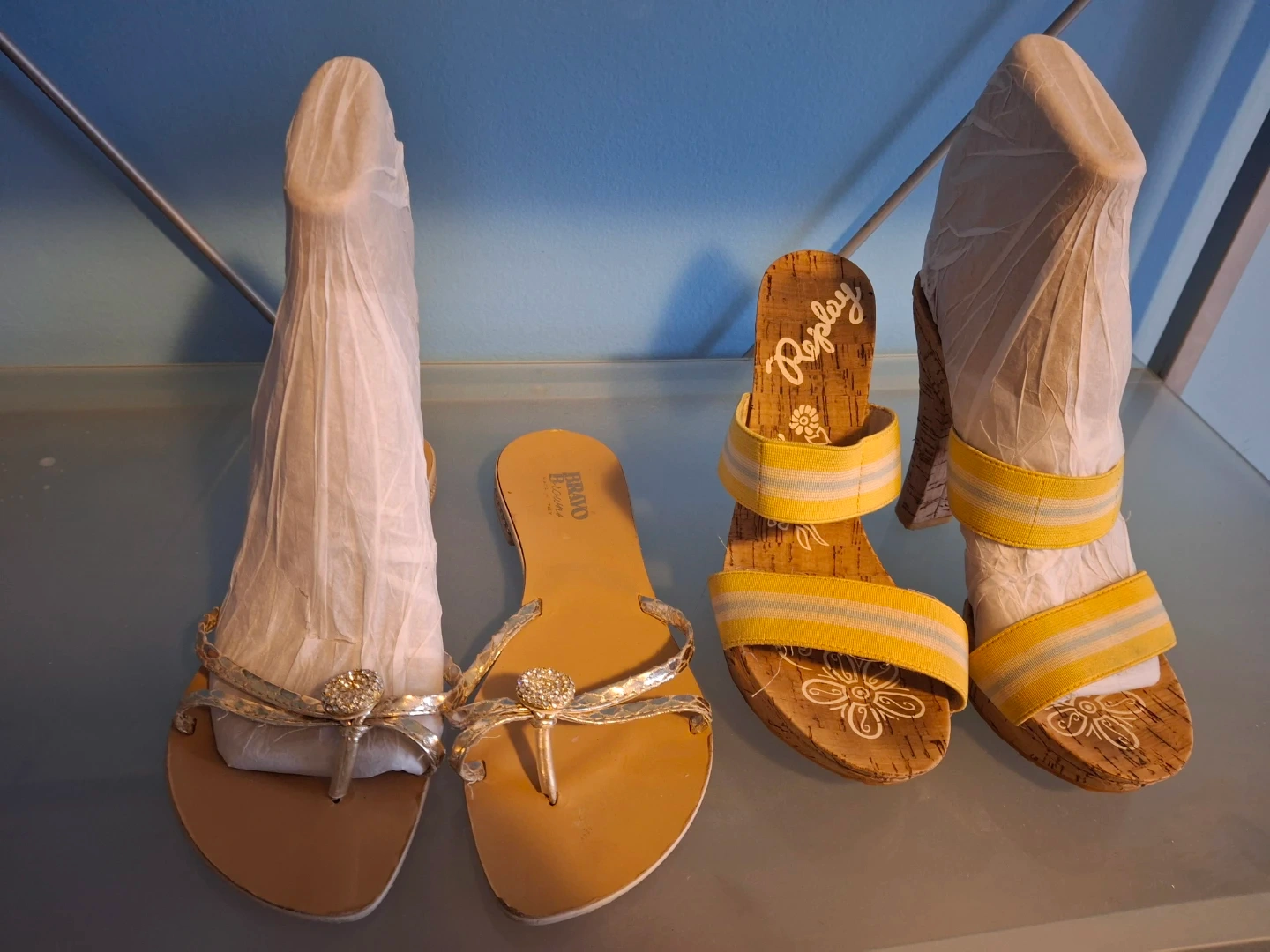 Cute pair of Replay heeled sandals in a size 38! They feature a cork-like material and yellow straps. Bravo Browns flat sandals with gold embellishment on straps and heels. Selling both for $45!