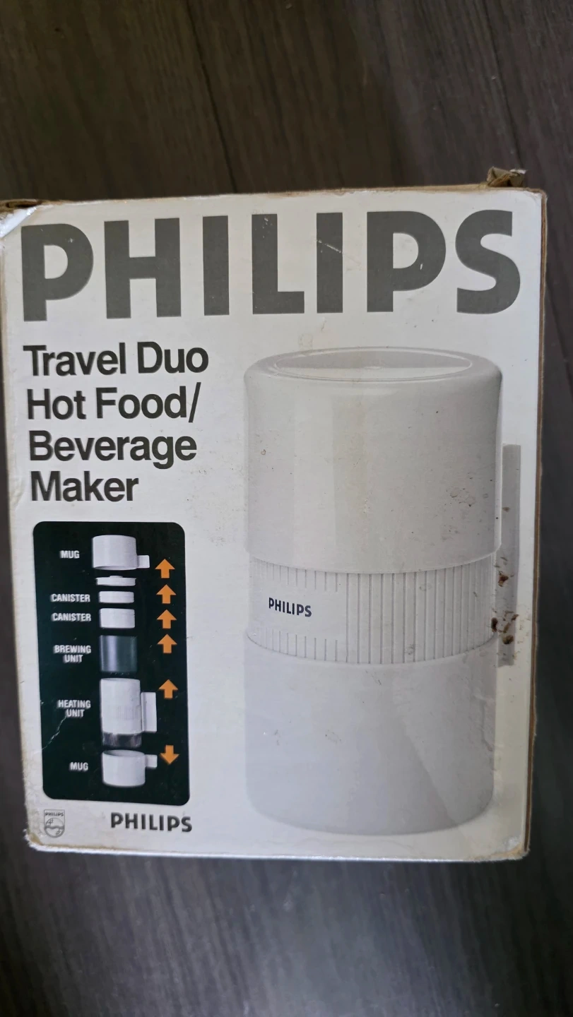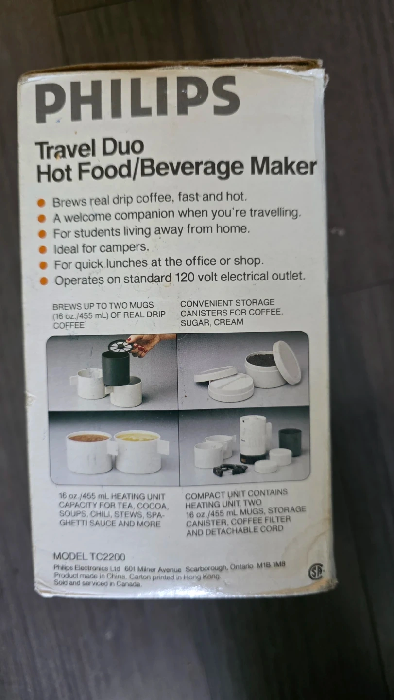 Selling a Philips Travel Duo Hot Food/Beverage Maker, model TC2200. It's a compact unit that contains a heating unit, two mugs, storage canisters, coffee filter and detachable cord. It brews up to two mugs (16 oz / 455 ml) of real drip coffee, fast and hot. It's great for students living away from home or for quick lunches at the office or shop! Operates on a standard 120 volt electrical outlet. Comes with the original box