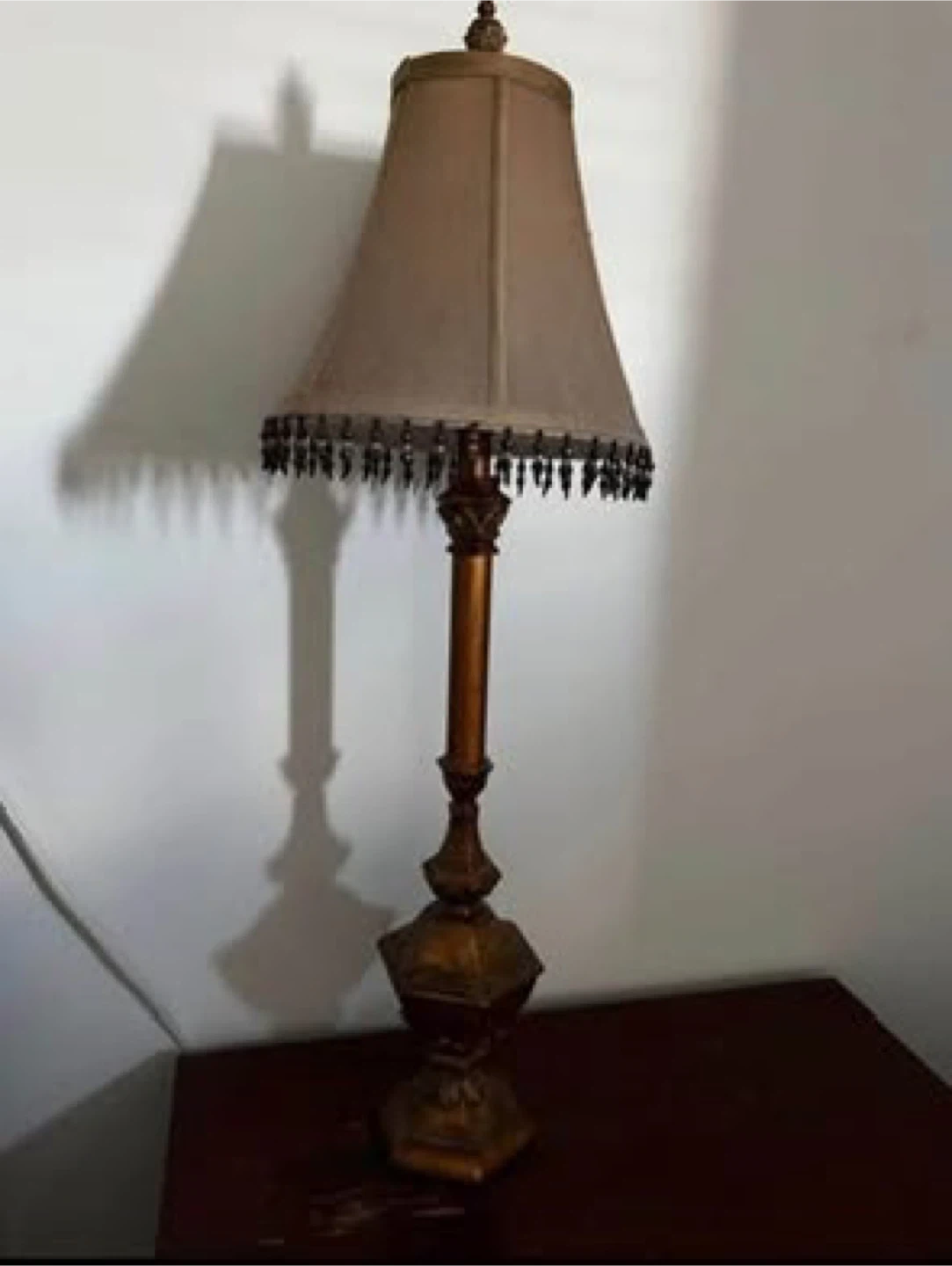 Beautiful matching pair of vintage-style lamps with gold base detailing and beaded trim shades. Both work perfectly.