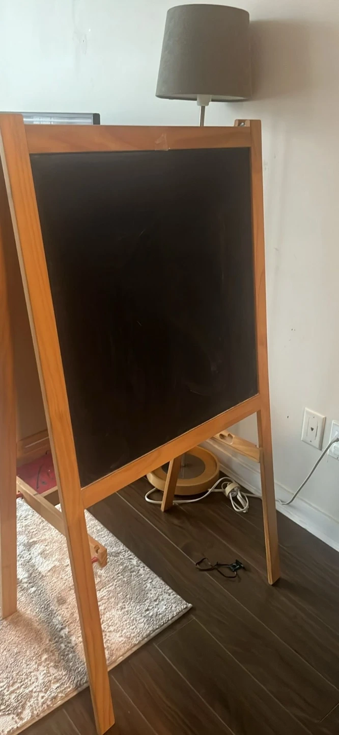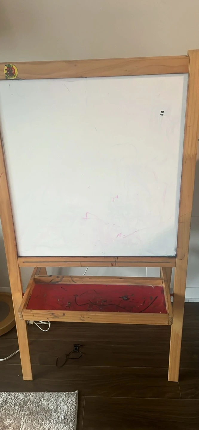Selling a wooden easel that's perfect for kids or anyone who loves to draw and paint. It has a whiteboard on one side and a chalkboard on the other. There's also a tray for holding art supplies!
