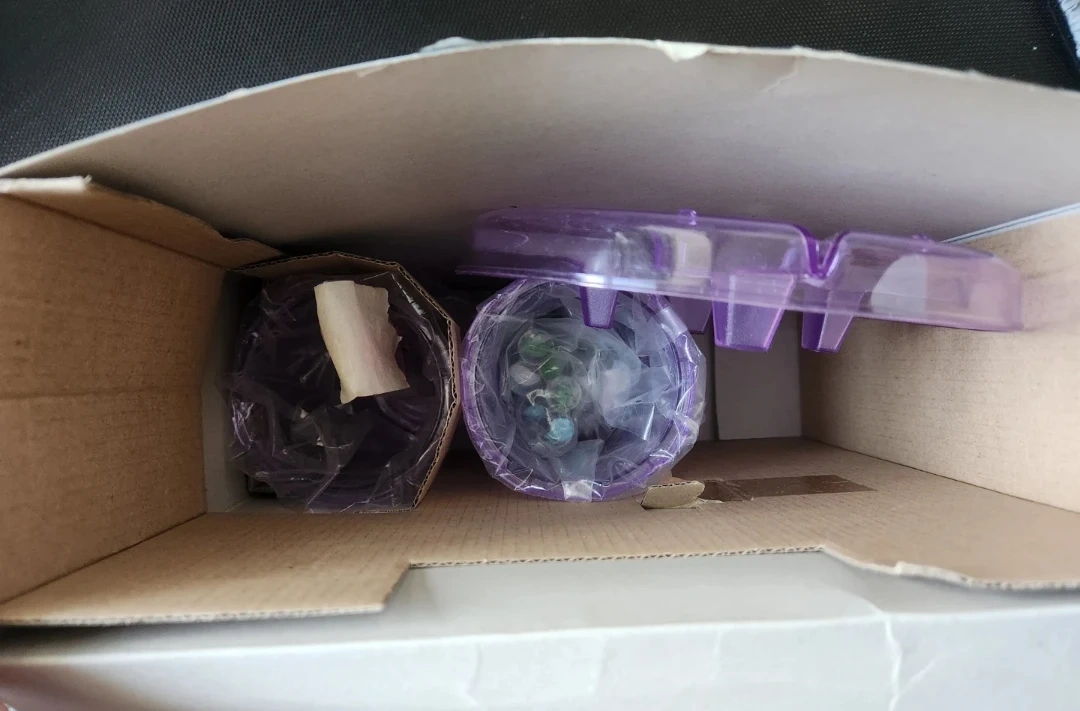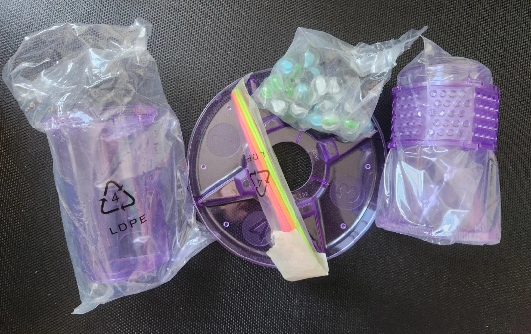 All components are there, including the marbles and sticks! Everything still has plastic packaging, everything essentially new and clean. Smoke and pet free household. Assembly is super quick and easy, you just need to connect the two cups, set up sticks, and pour marbles. Easy clean up too, as marbles land in the bottom layer which is sectioned. Don't let the marbles fall!