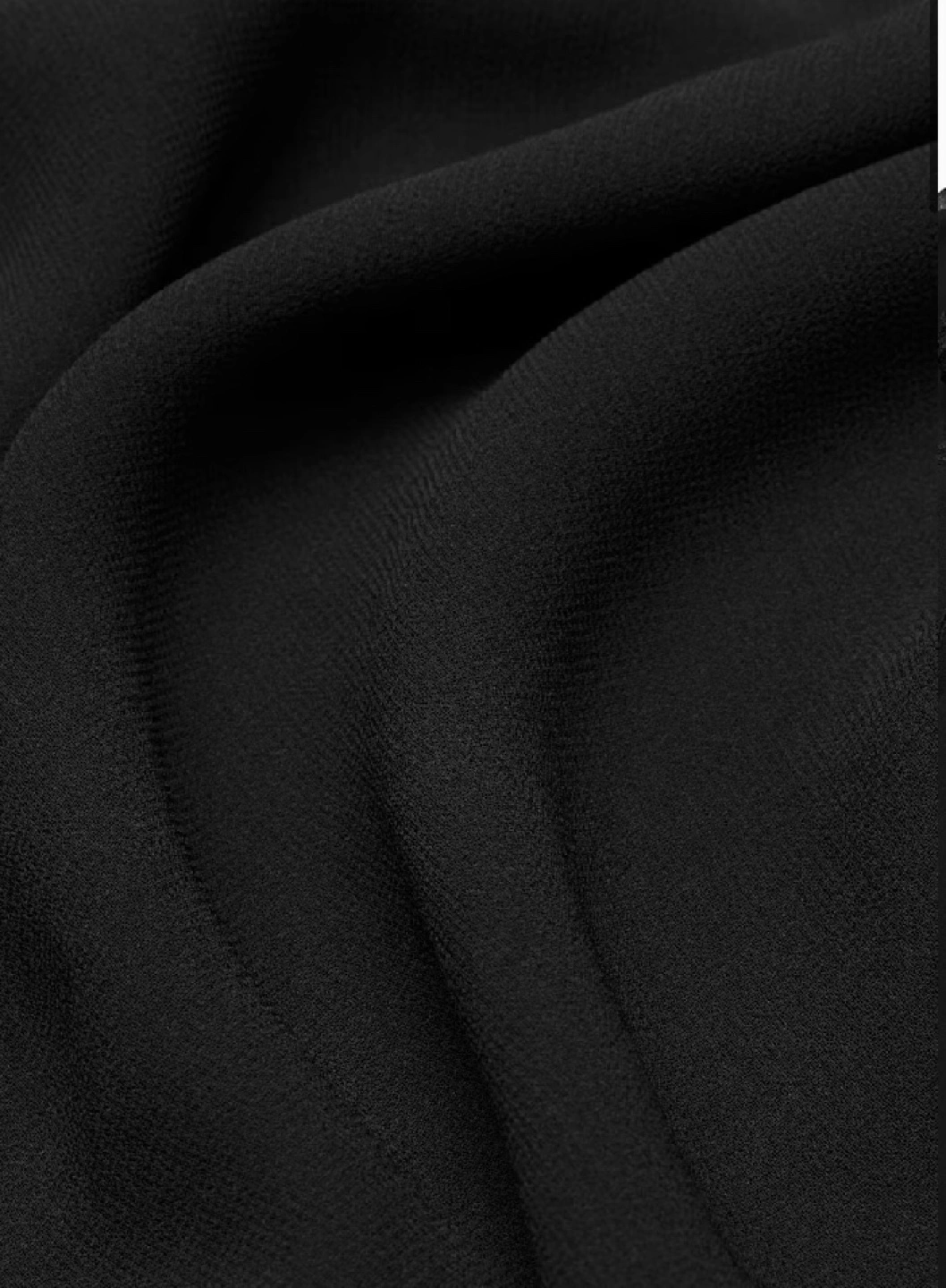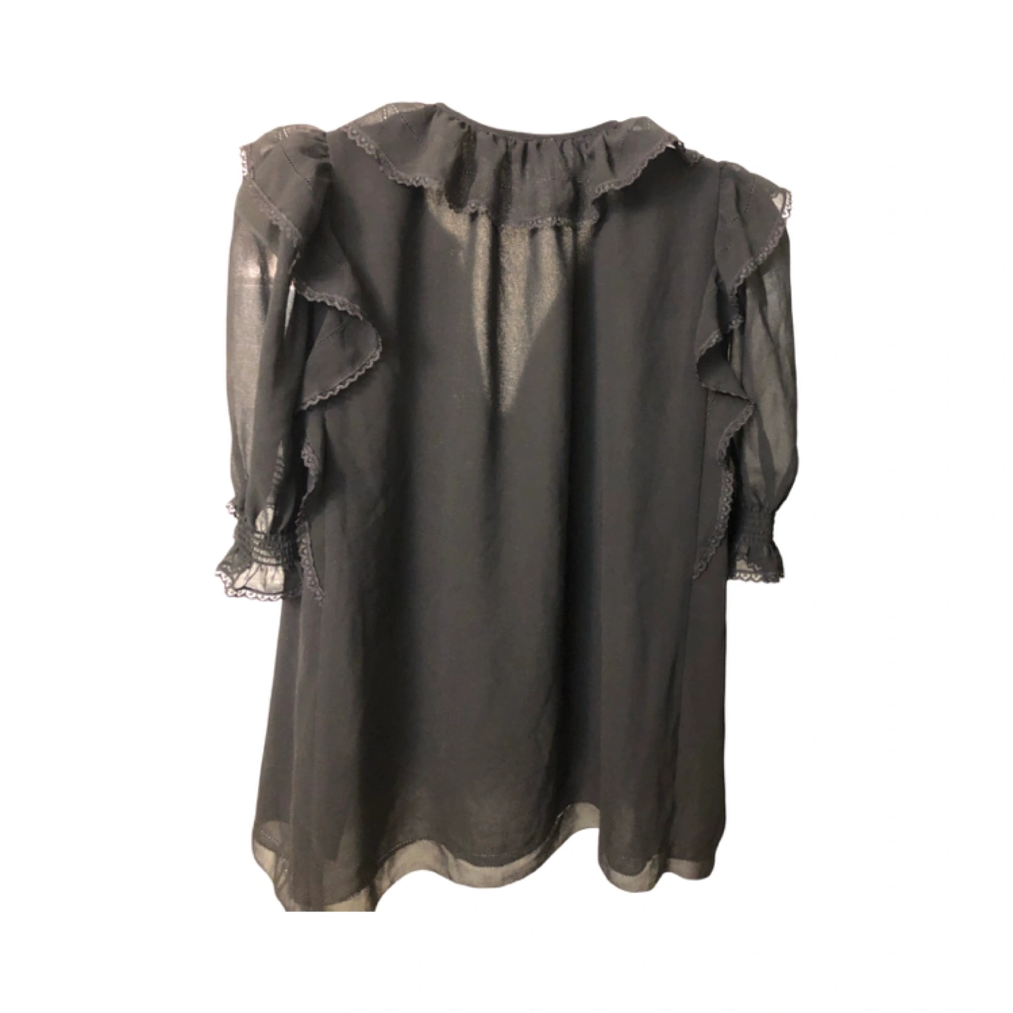 It’s a romantic, vintage piece, made from lightweight semi-sheer crepe chiffon. It features a flattering V-neck and delicate lace detailing. Perfect for dressing up or down!
