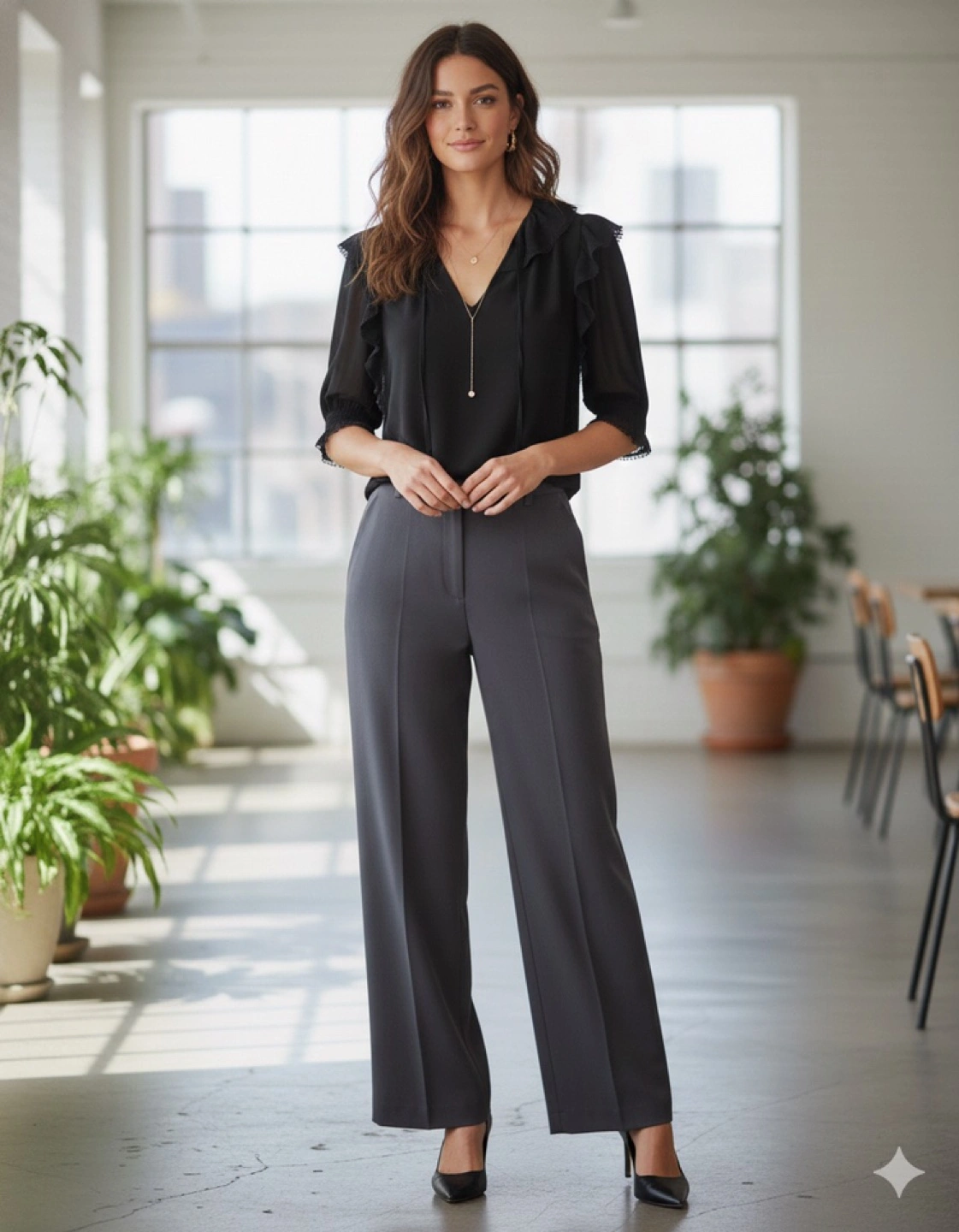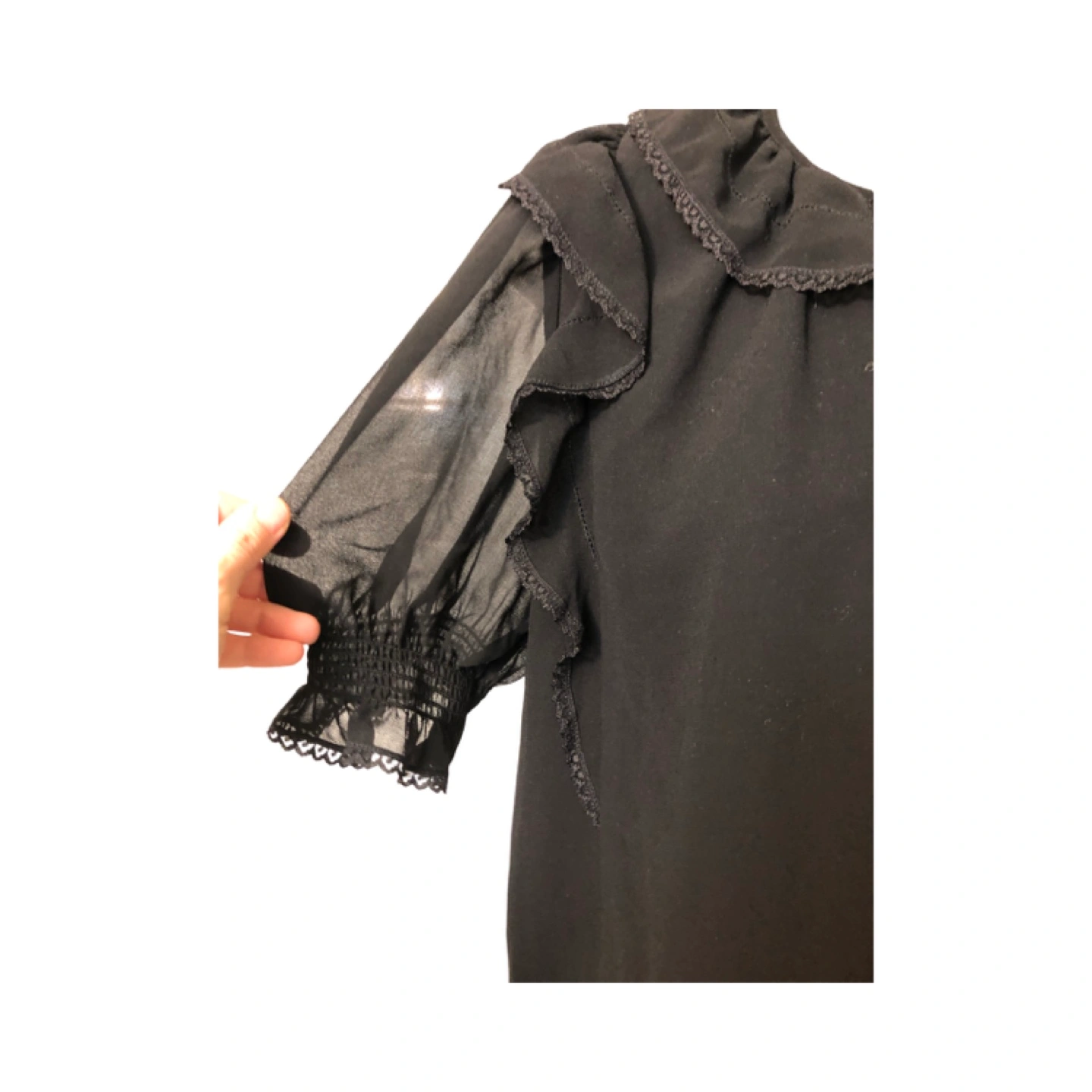 It’s a romantic, vintage piece, made from lightweight semi-sheer crepe chiffon. It features a flattering V-neck and delicate lace detailing. Perfect for dressing up or down!