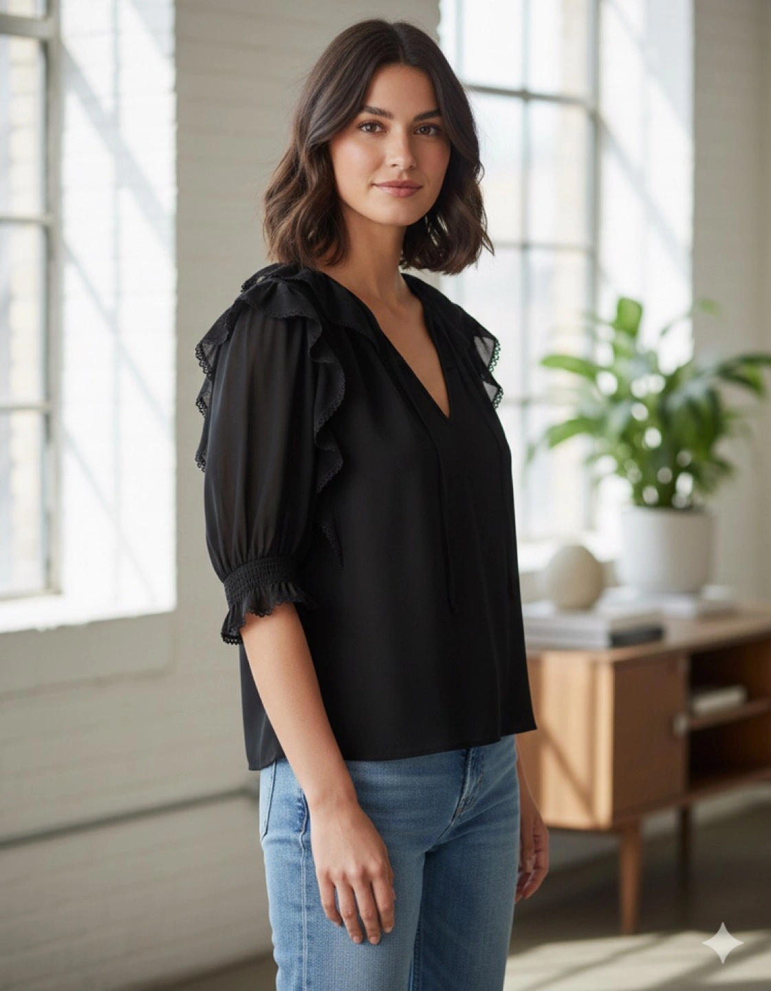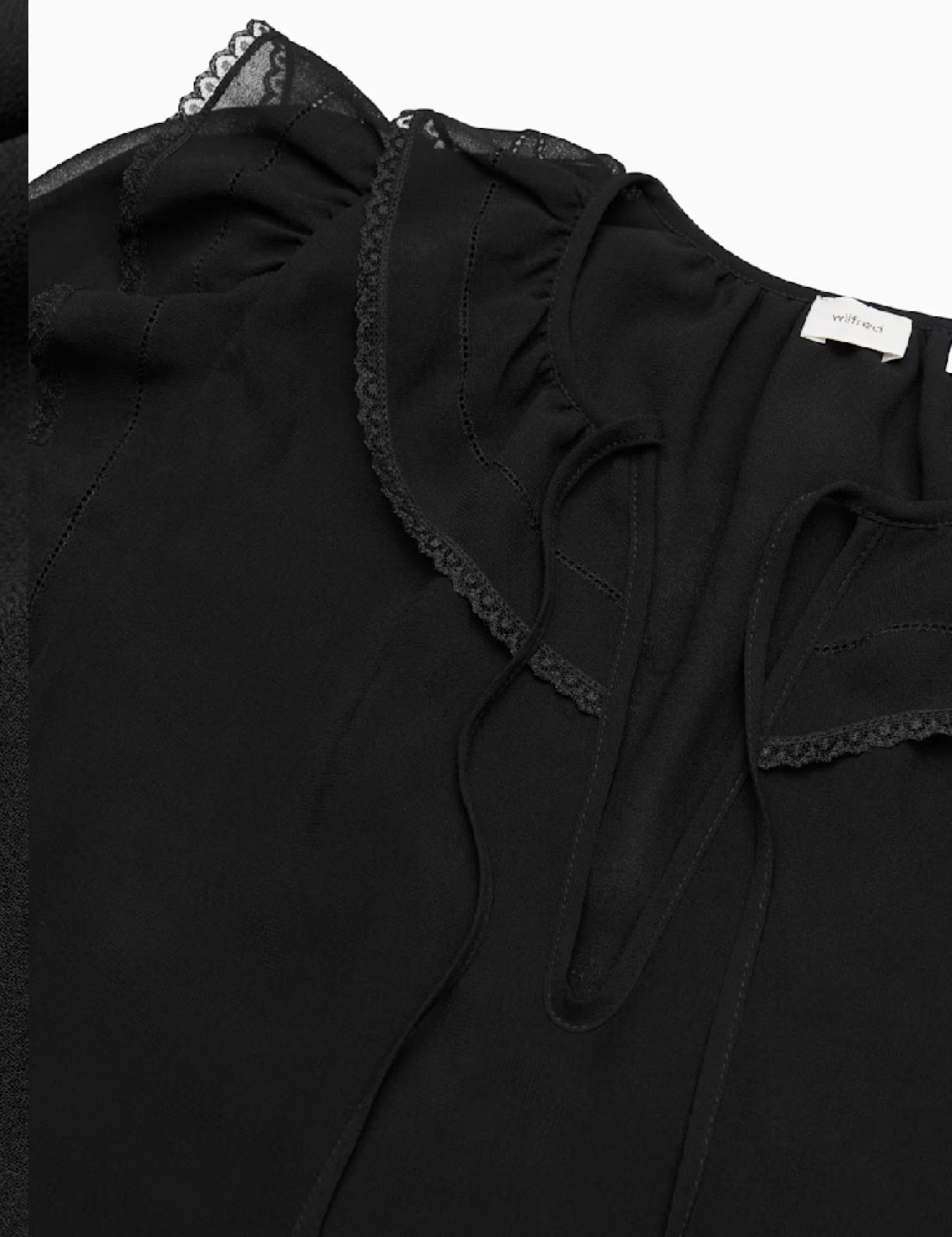 Wilfred Aritzia Amyris Tie-Front ruffle blouse in black, size small.