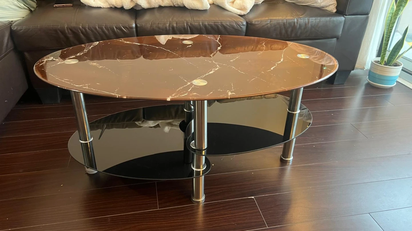 Selling an oval glass coffee table! It has a faux marble design on the top glass and a black glass shelf underneath. The legs are a shiny chrome colour. It's in great condition and would look great in any living room