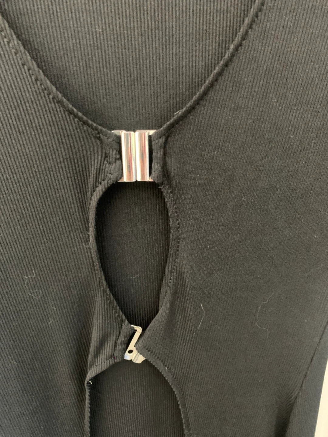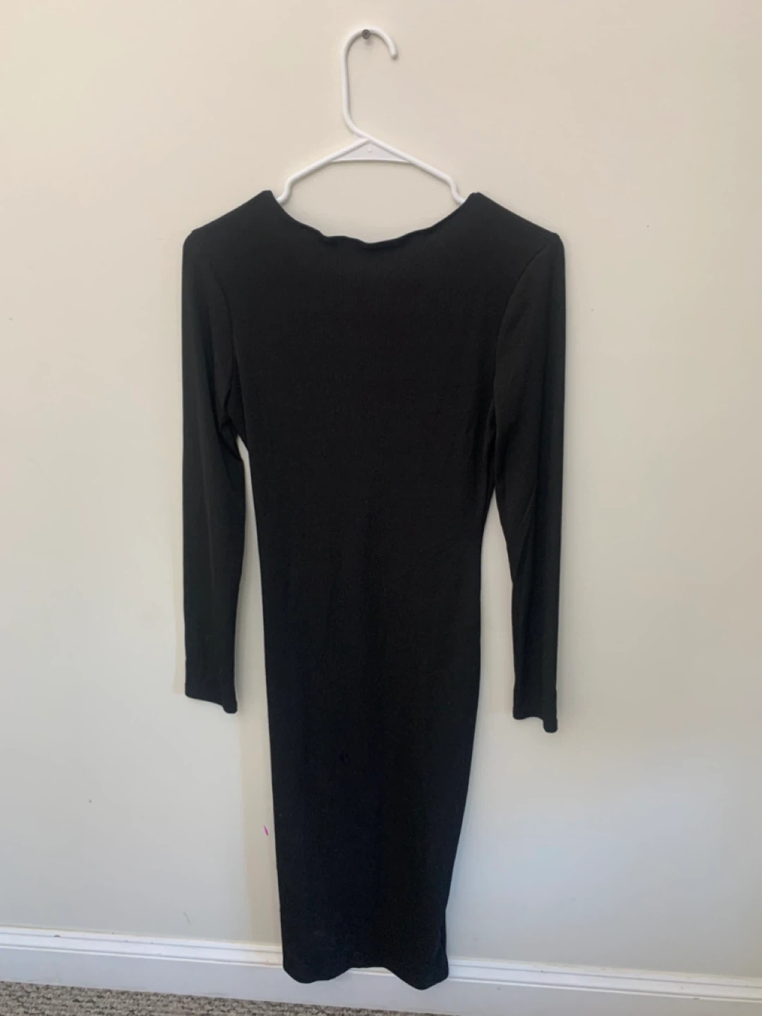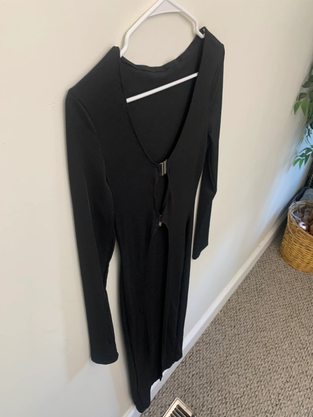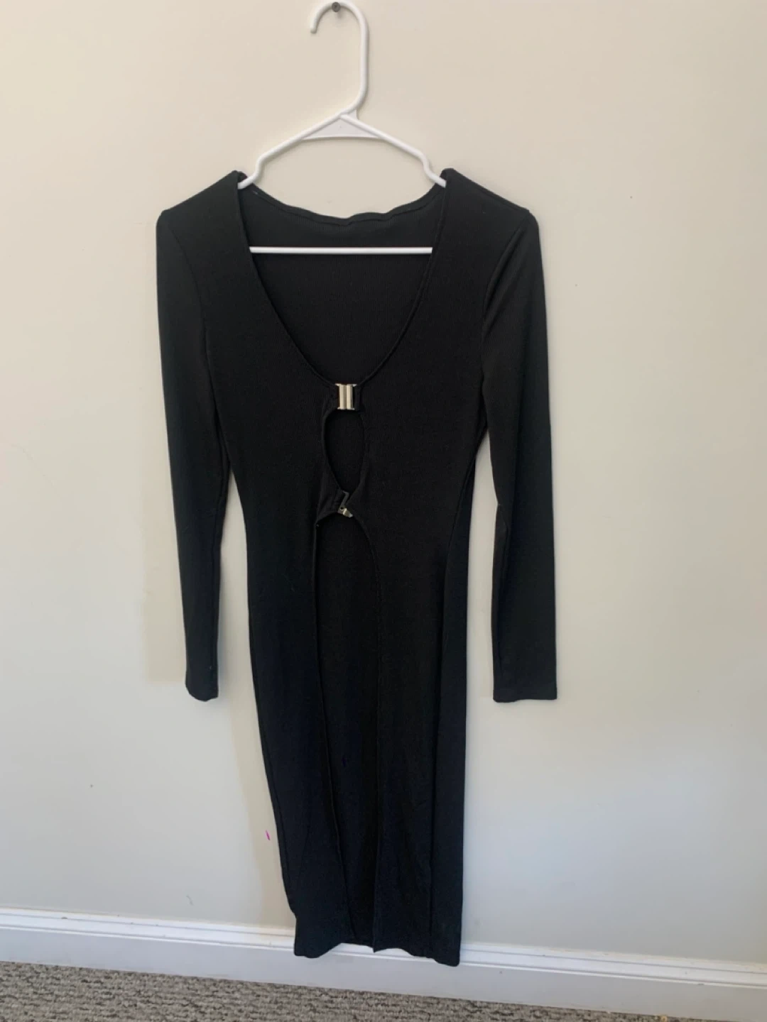 Selling a cute black long sleeve dress. It has a unique front detail with a small opening and a silver clasp. Perfect for a night out or a special occasion!