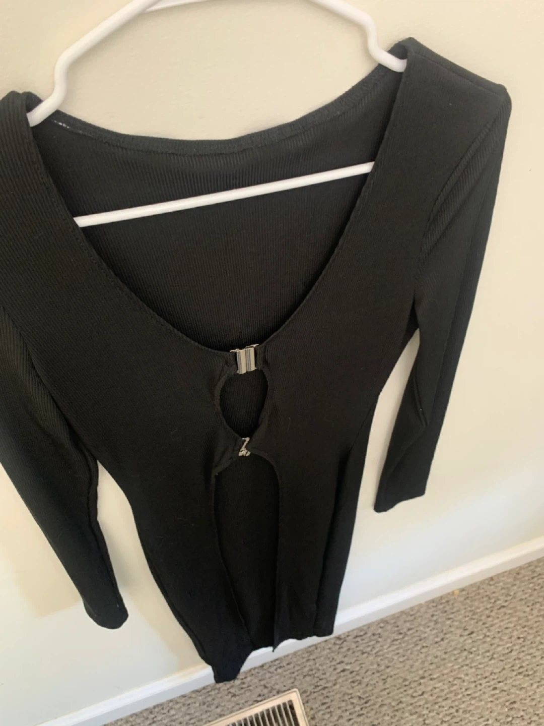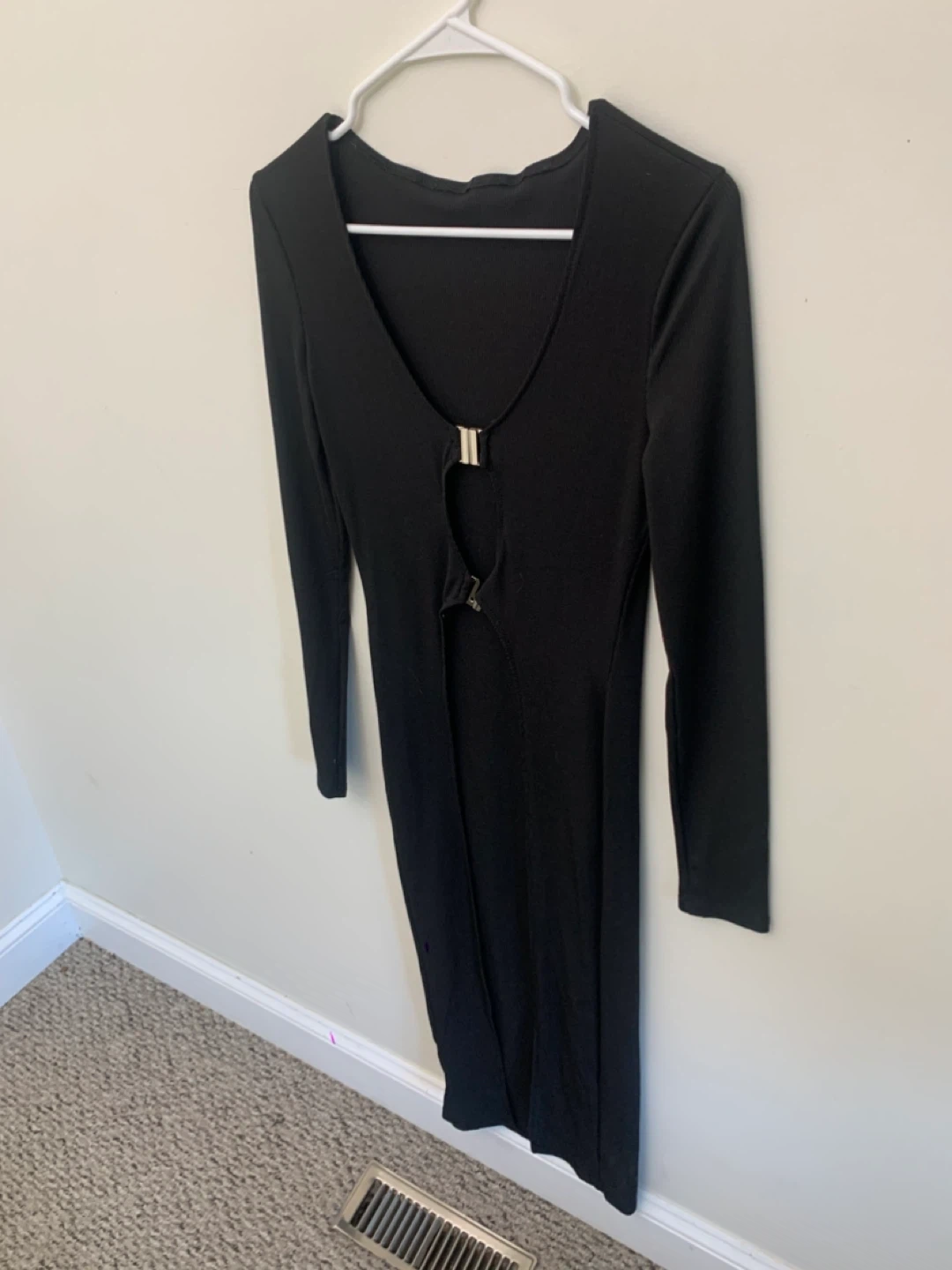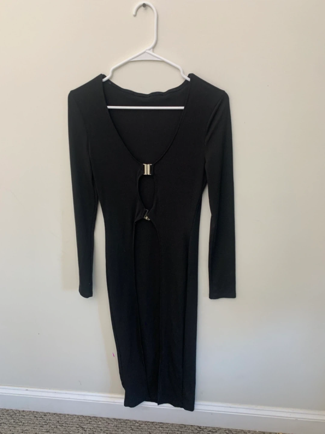 Selling a cute black long sleeve dress. It has a unique front detail with a small opening and a silver clasp. Perfect for a night out or a special occasion!