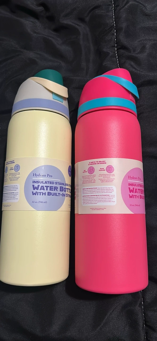 I have a Hydrate Pro insulated stainless steel water bottle with a built-in straw available. It holds 32 oz (946 ml). Perfect for staying hydrated on the go!