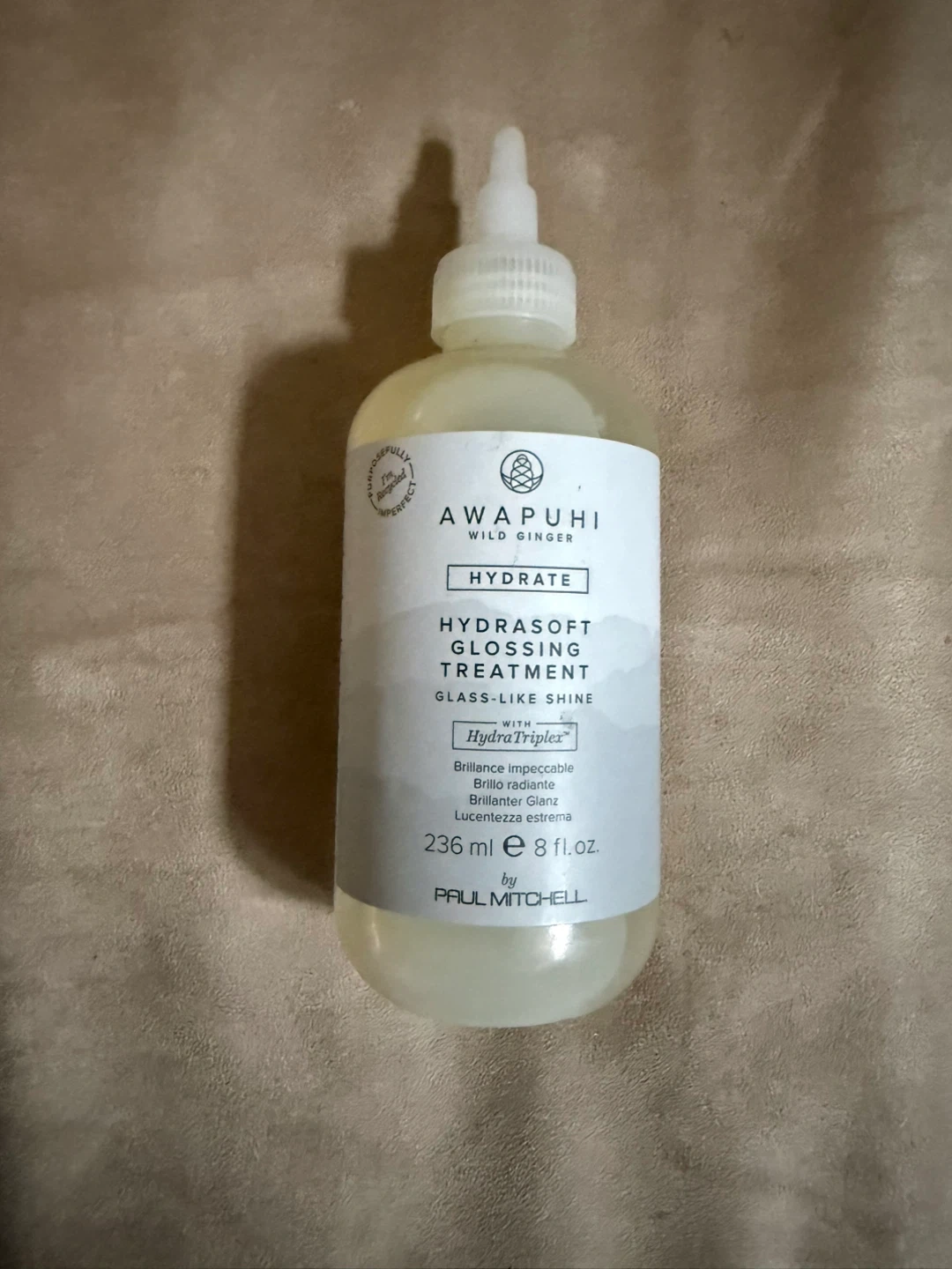 Selling a bottle of Paul Mitchell Awapuhi Wild Ginger Hydrasoft Glossing Treatment. It's designed to give your hair a glass-like shine! The bottle contains 236 ml of product.