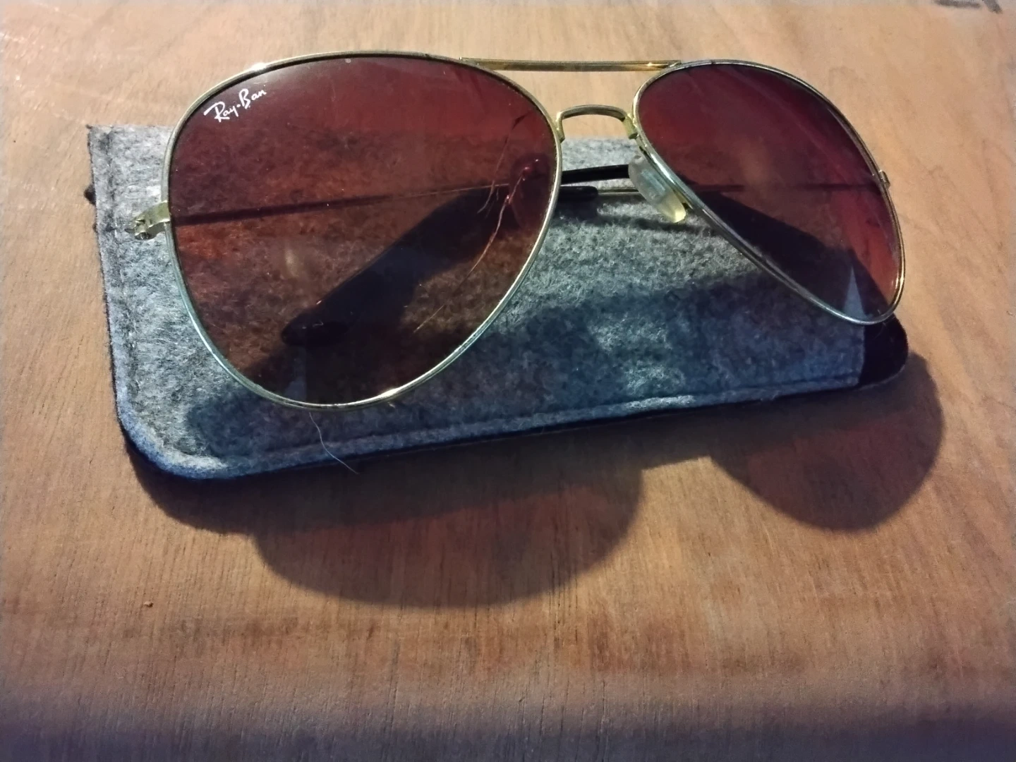 The sunglasses in the image are a pair of Ray-Ban Aviator style sunglasses with a gold-tone metal frame and brown or reddish-brown gradient lenses. This classic model is widely recognized and has been an iconic style since it was originally designed for U.S. aviators in 1937.