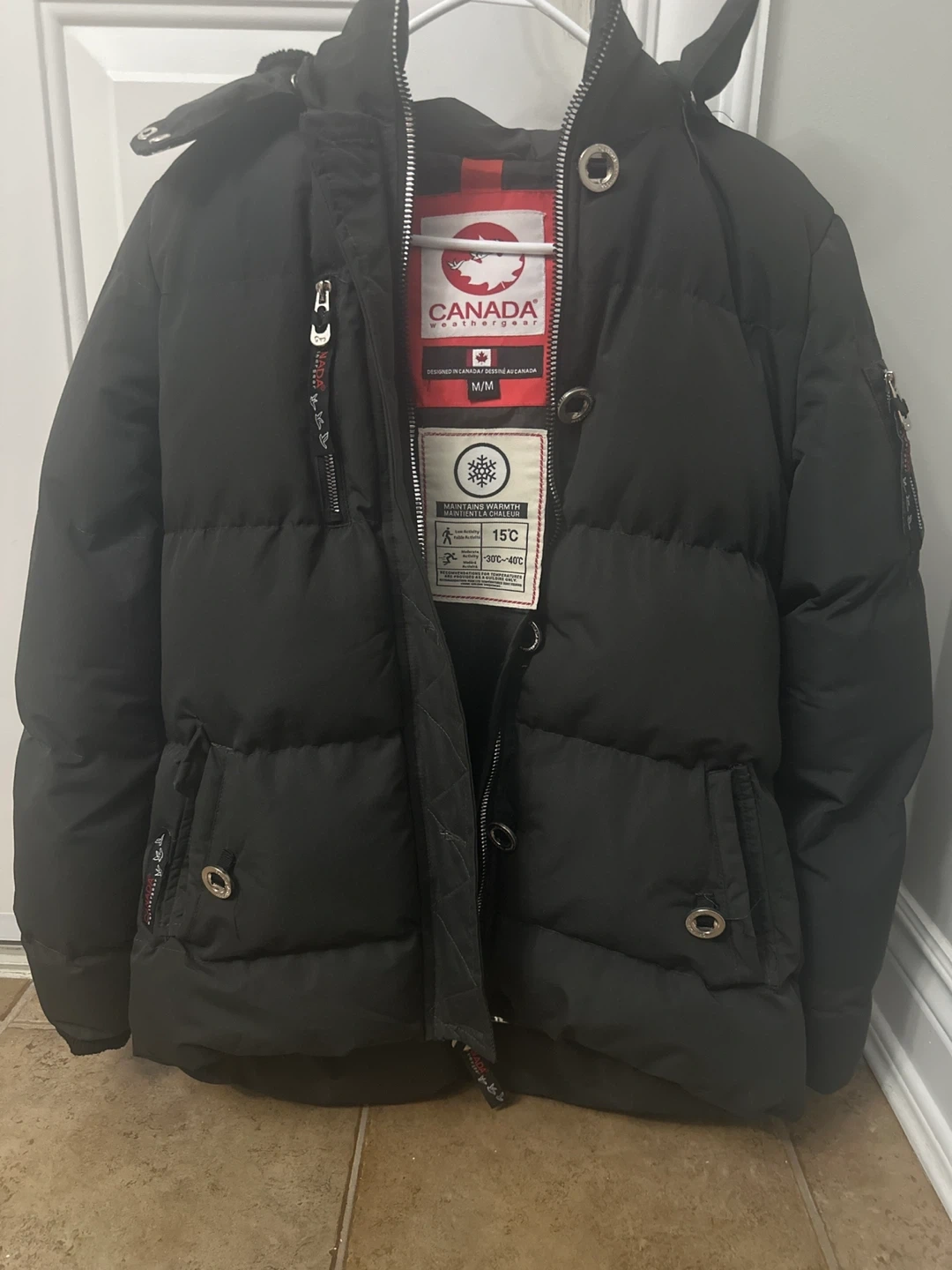 Canada Weathergear down puffer jacket, designed in Canada! It's marked as size M/M and maintains warmth in temperatures as low as -30°C to -40°C. Perfect for our cold Canadian winters!